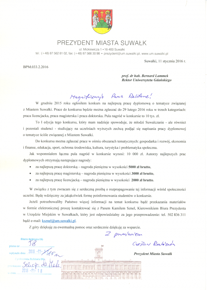 Bliższych informacji udziela kierownik Biura Prezydenta w Urzędzie Miejskim W Suwałkach, p. Kamil Sznel (502 83 63 11, ksznel@um.suwalki.pl).
