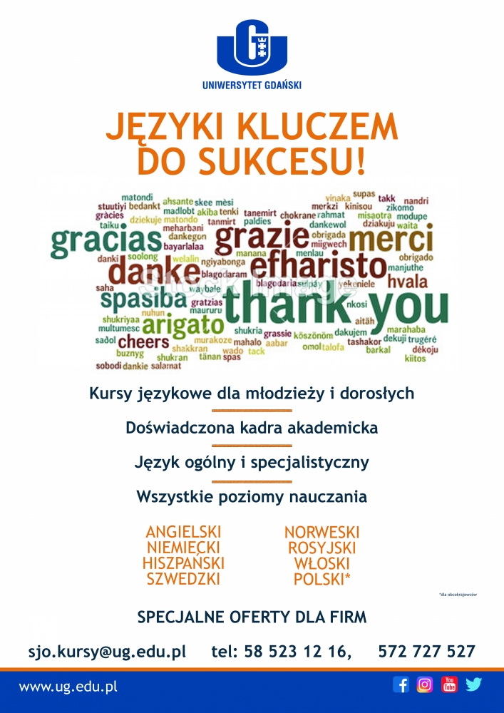 Studium Języków Obcych UG we współpracy z Fundacją Rozwoju Uniwersytetu Gdańskiego zapraszają na kursy językowe prowadzone przez doświadczonych lektorów akademickich. Oferujemy naukę języków: angielskiego, niemieckiego, szwedzkiego, hiszpańskiego, francuskiego, włoskiego, norweskiego, rosyjskiego oraz polskiego dla obcokrajowców na wszystkich poziomach zaawansowania. Przeprowadzamy także egzaminy certyfikatowe.