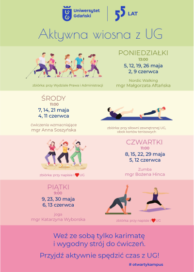- NORDIC WALKING - Mondays, 1:00 p.m. (5, 12, 19, 26 May, 2 and 9 June) - Mgr Małgorzata Aftańska, meeting point at the Faculty of Law and Administration of the University of Gdańsk