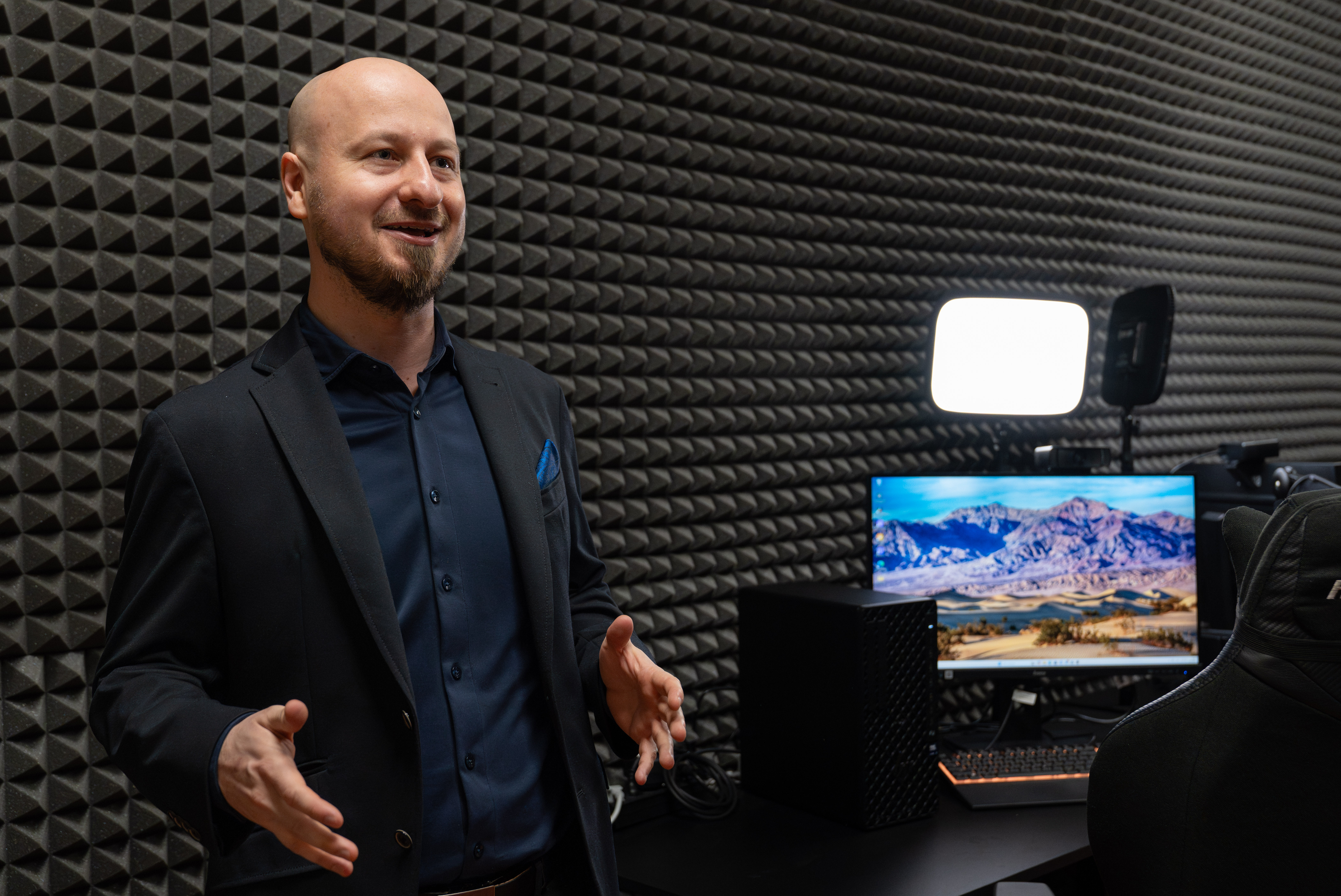 Studio wyposażono również w dwa stanowiska pracy z komputerami, monitorami oraz ergonomicznymi biurkami o elektrycznie regulowanej wysokości i fotelami z zagłówkami, umożliwiające komfortową pracę indywidualną i zespołową, w tym realizację wywiadów. Całość uzupełnia profesjonalne oprogramowanie z pakietu Adobe Creative Cloud do montażu i postprodukcji materiałów.