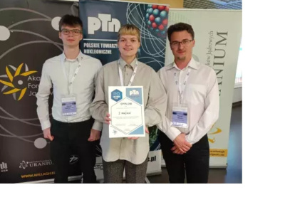 Marta Wróblewska, Adrian Hadrzyński i Paweł Obara - czyli zespół Nukelorybki - zajęli I miejsce w polskim finale międzynarodowego konkursu Innovation for Nuclear Europe (I4N Europe). Polski finał konkursu odbył się podczas VII Akademickiego Forum Jądrowego na Akademii Górniczo-Hutniczej w Krakowie.