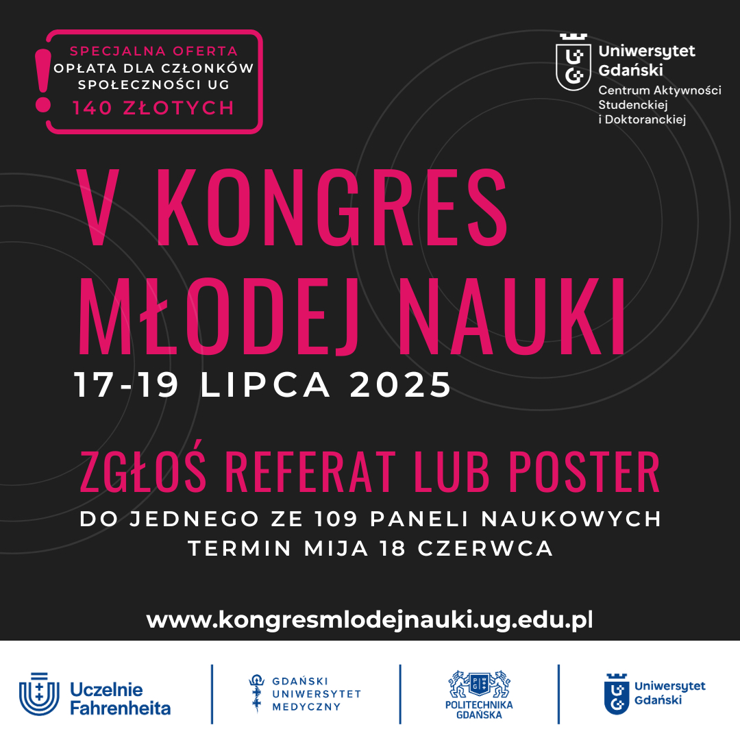 Już w lipcu odbędzie się V Kongres Młodej Nauki - wyjątkowe, międzynarodowe i multidyscyplinarne wydarzenie, które umożliwia młodym naukowcom, doktorantom i studentom zaprezentowanie wyników swoich badań oraz nawiązanie kontaktów naukowych i wymianę doświadczeń. Tegoroczna edycja konferencji wpisze się w obchody 55-lecia powołania Uniwersytetu Gdańskiego. Do 18 czerwca 2025 r. trwa nabór referatów i posterów.