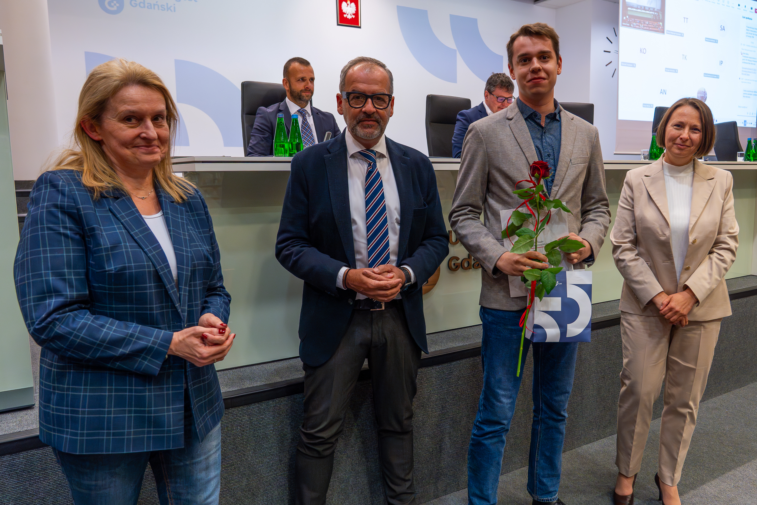 Następnie, z rąk Rektora prof. dr. hab. Piotra Stepnowskiego i Prorektora ds. Badań Naukowych prof. dr. hab. Wiesława Laskowskiego gratulacje z okazji uzyskania tytułu profesorów belwederskich odebrali: prof. dr hab. Adriana Mika (Wydział Chemii), prof. dr hab. Natasza Kosakowska-Berezecka (Wydział Nauk Społecznych), prof. dr hab. Iwona Mruk (Wydział Biologii), prof. dr hab. Rafał Makała (Wydział Historyczny) i prof. dr hab. Grzegorz Szamocki (Wydział Historyczny). Z kolei Prorektor ds. Studenckich dr hab. Urszula Patocka-Sigłowy, prof. UG, Prorektor ds. Kształcenia dr Ewa Szymczak, prof. UG wraz z Rektorem wręczyli dyplom  studentowi Markowi Barbarewiczowi z okazji otrzymania przez niego stypendium Ministra Nauki i Szkolnictwa Wyższemu za znaczące osiągnięcia na rok akademicki 2024/2025.
