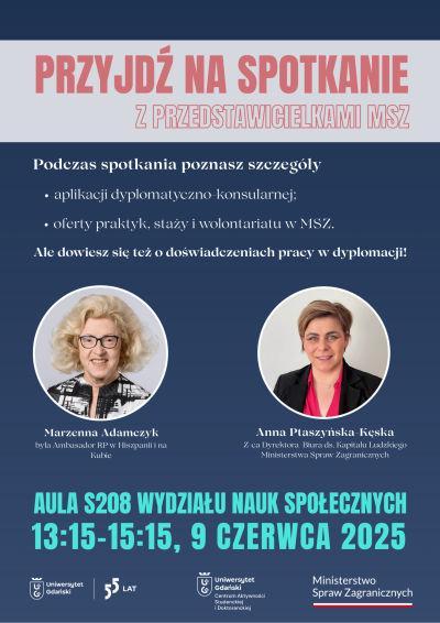 Marzycie o międzynarodowej karierze? Interesujecie się dyplomacją i współpracą konsularną? Zastanawiacie się, jak rozpocząć pracę w resorcie spraw zagranicznych? 9 czerwca na Wydziale Nauk Społecznych UG odbędzie się spotkanie, podczas którego przedstawicielki MSZ opowiedzą o wyzwaniach pracy w służbie zagranicznej oraz przybliżą możliwości odbycia praktyk, staży i wolontariatów w resorcie.