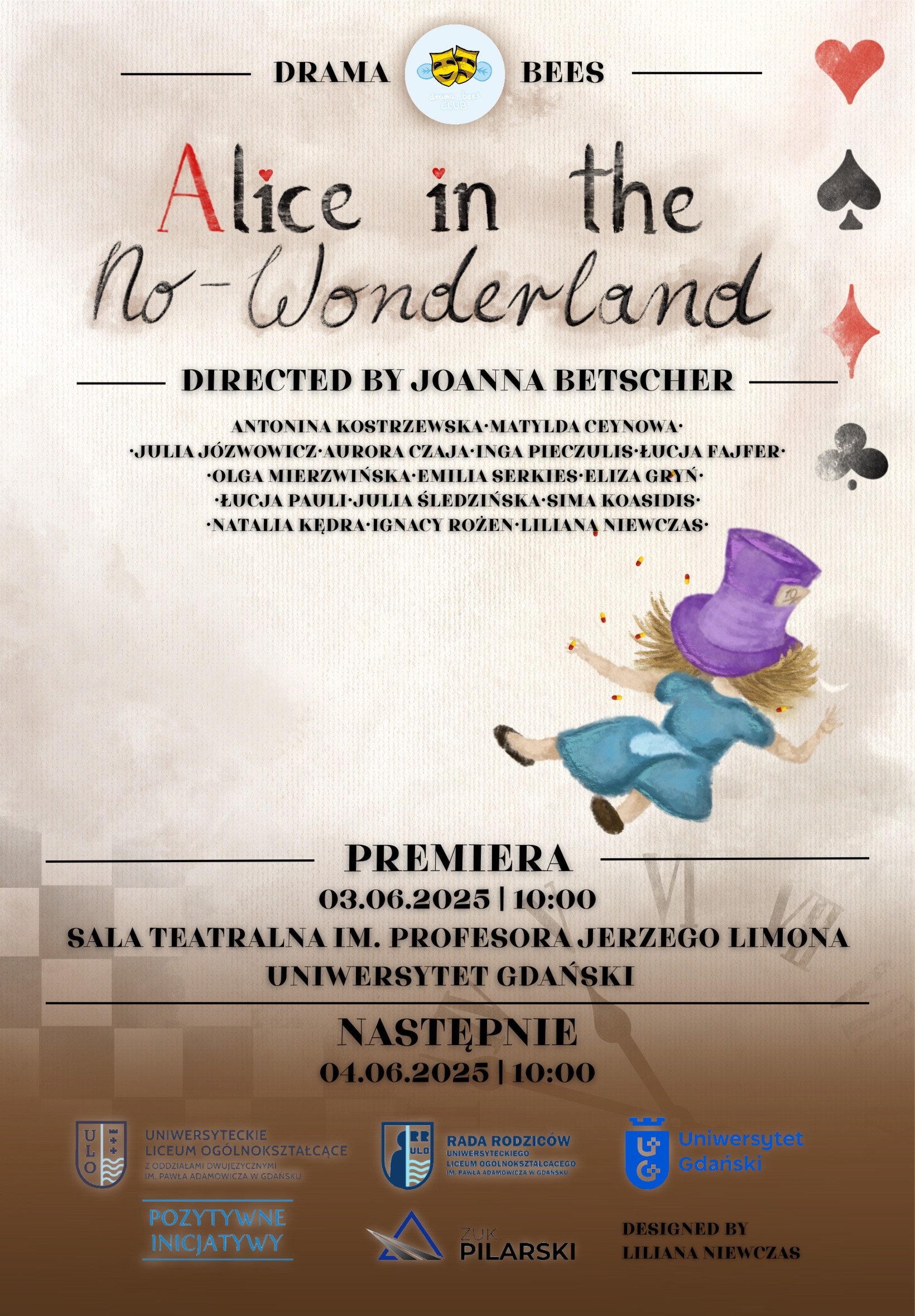 Uczniowie Uniwersyteckiego Liceum Ogólnokształcącego z Oddziałami Dwujęzycznymi im. Pawła Adamowicza działający w kole teatralnym Drama Bees wystąpili na deskach Sali Teatralnej im. prof. Jerzego Limona. Młodzi adepci teatru przedstawili spektakl „Alice in the No-Wonderland” będący adaptacją słynnej powieści Lewisa Carrolla „Alicja w krainie czarów” („Alice’s Adventures in Wonderland”).
