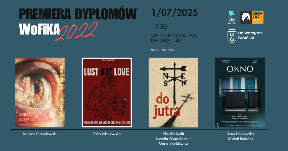 Trzy krótkometrażowe filmy dokumentalne i krótkometrażowa fabuła, które zostaną zaprezentowane 1 lipca, to prace dyplomowe studentów zaocznych kierunku Wiedza o filmie i kulturze audiowizualnej z rocznika 2022. Jest to jednocześnie symboliczne zwieńczenie studiów i pierwszy pokaz ich obrazów przed szerszą publicznością.