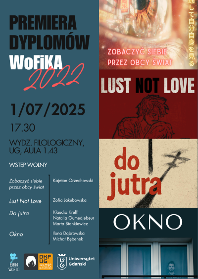 1 lipca o godz. 17.30 w auli 1.43 na Wydziałach Historycznym i Filologicznym UG odbędzie się premiera filmów dyplomowych studentów Wiedzy o filmie i kulturze audiowizualnej Uniwersytetu Gdańskiego. Jeśli chcecie się przekonać, czym żyje młode pokolenie wkraczające w świat branży filmowej, koniecznie zobaczcie ich obrazy. Wstęp na projekcje jest wolny.