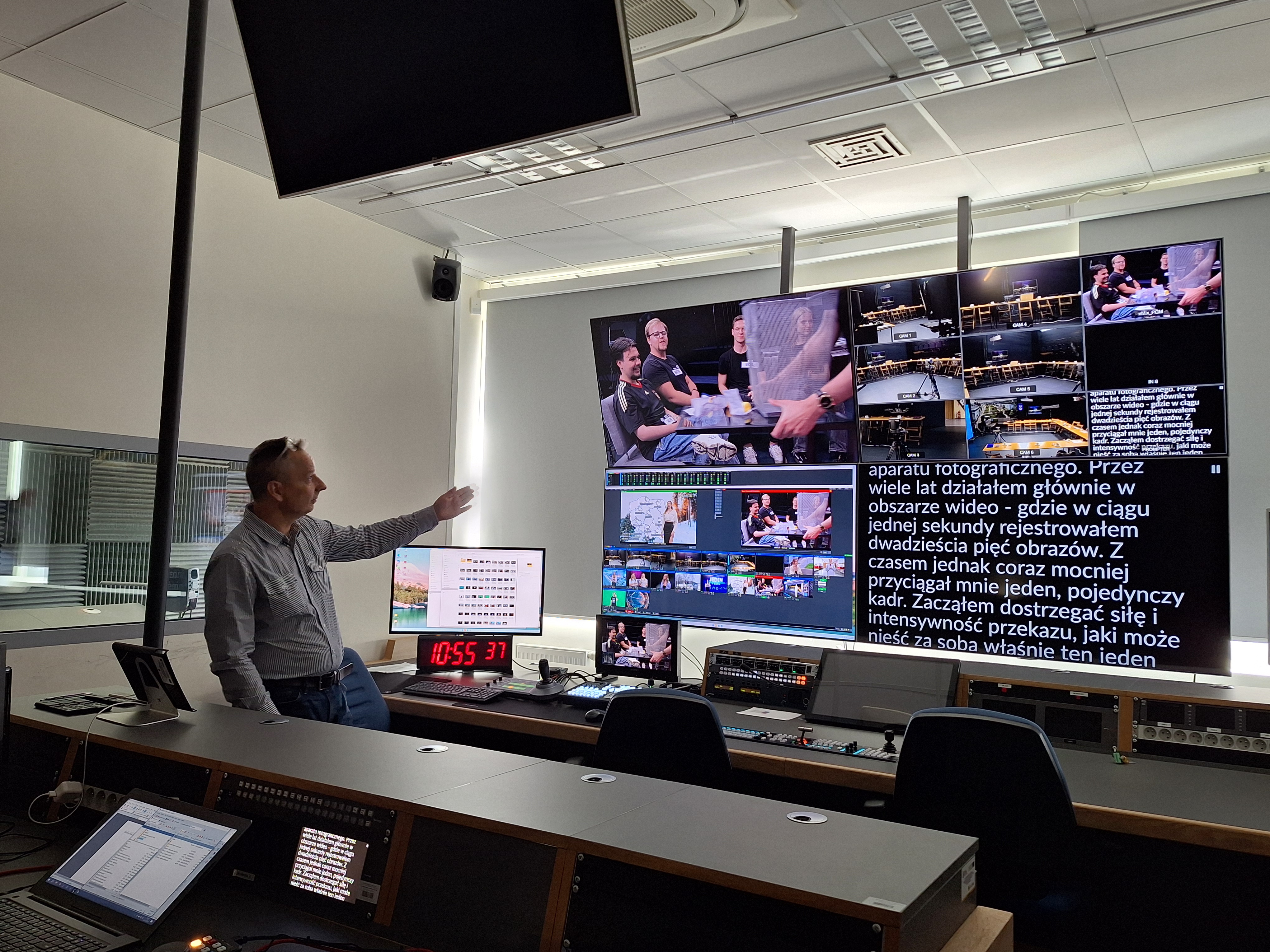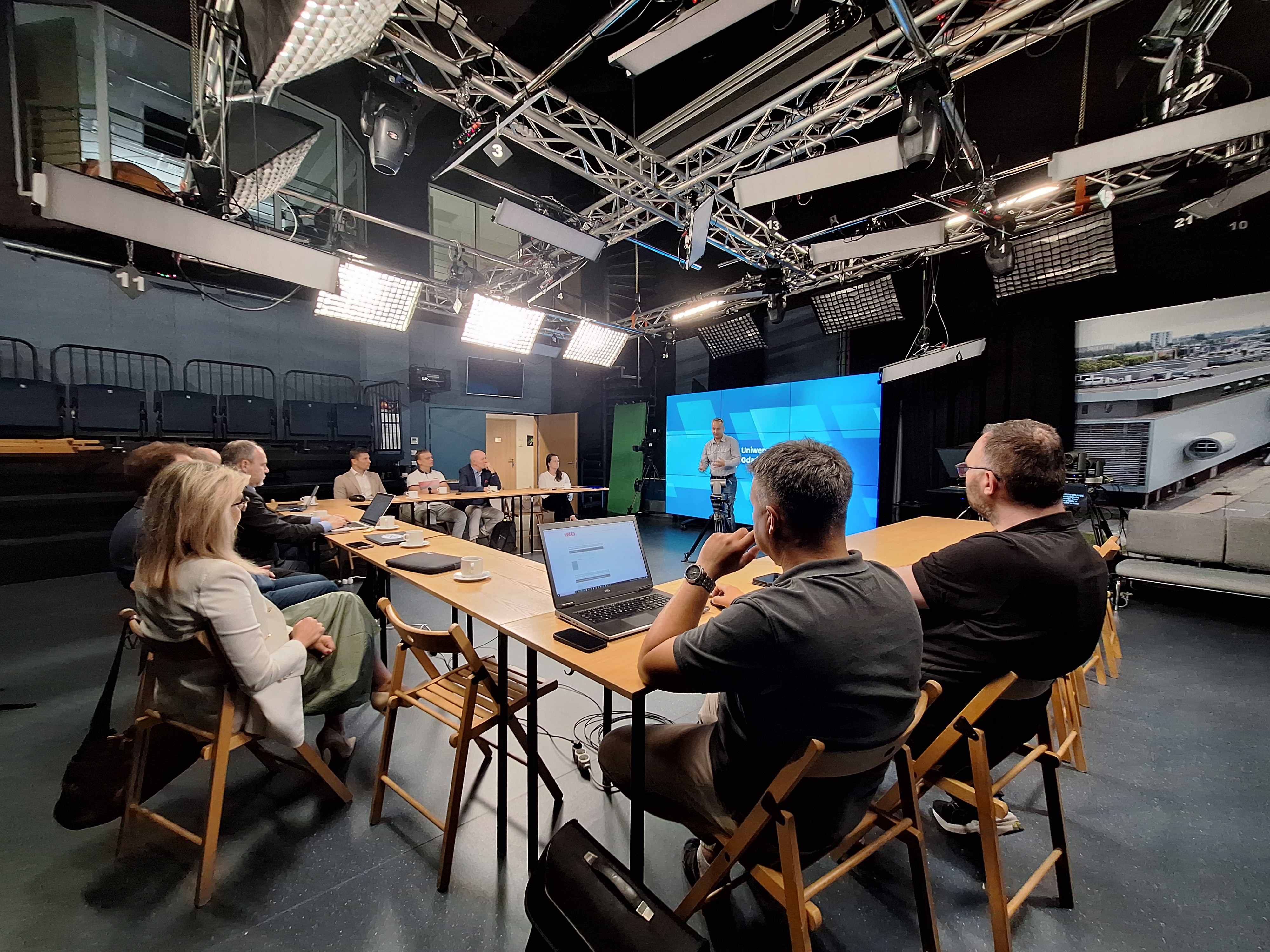 Spotkanie 4 lipca miało na celu przede wszystkim omówienie bieżących wyzwań związanych z działalnością CI TASK. Jego uczestnicy mieli także okazję zapoznać się z Laboratorium Symulacji Nagrań Telewizyjnych i Dokumentacji Filmowej, mieszczącym się w budynku Wydziału Nauk Społecznych UG. O Laboratorium, jego historii i stosowanych rozwiązaniach technologicznych w kontekście zmieniających się realiów opowiedział Wojciech Głodek, Dyrektor Centrum Produkcji Filmowej i Dokumentalnej UG.