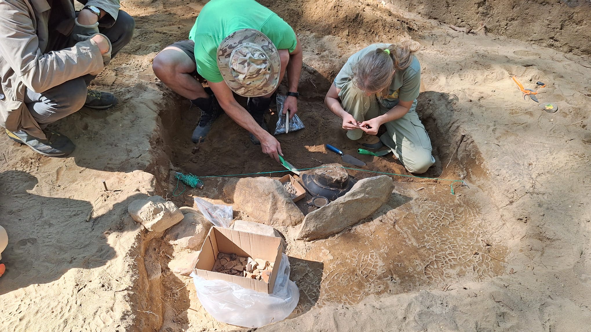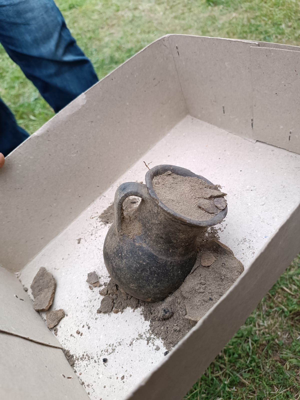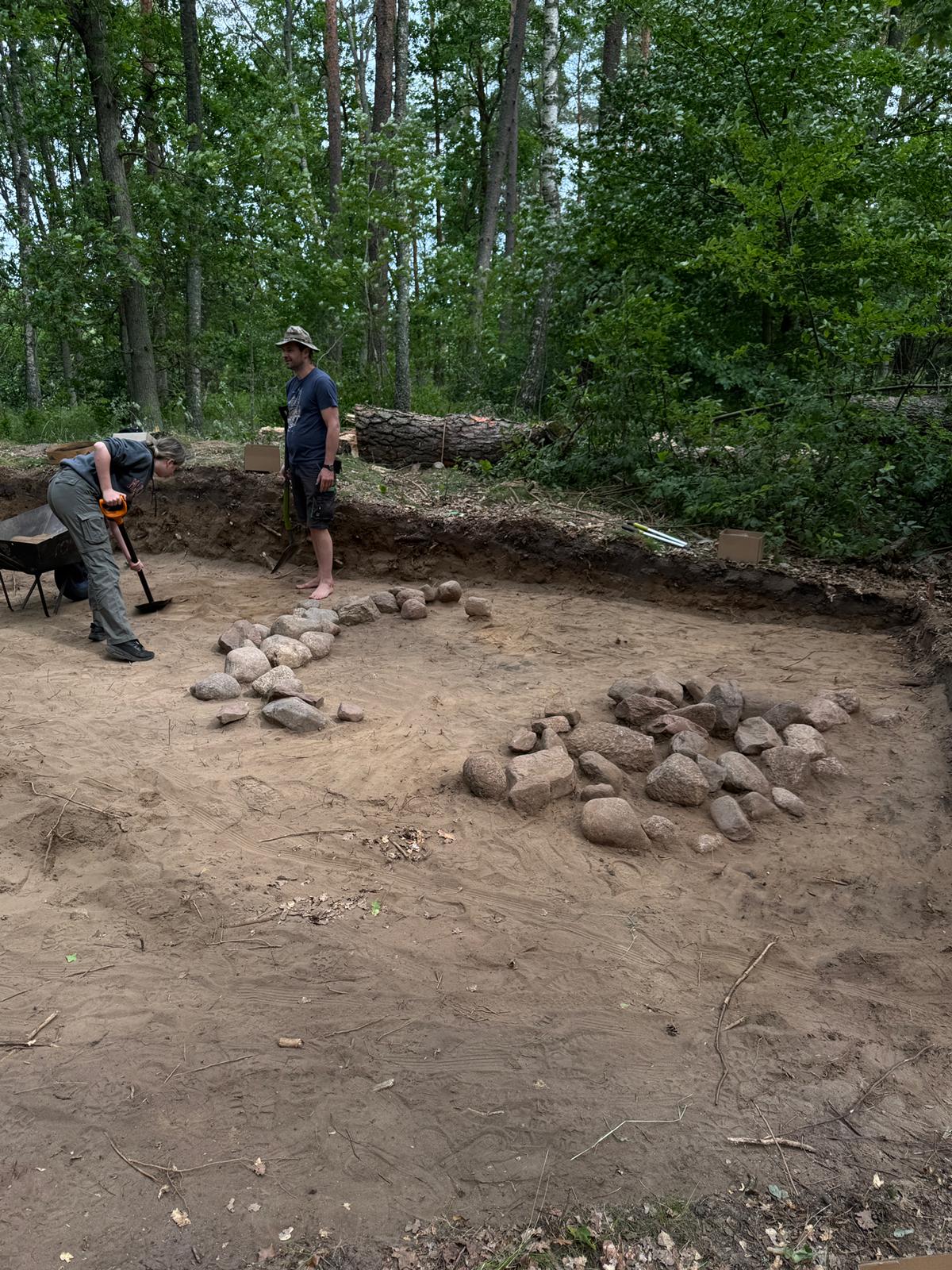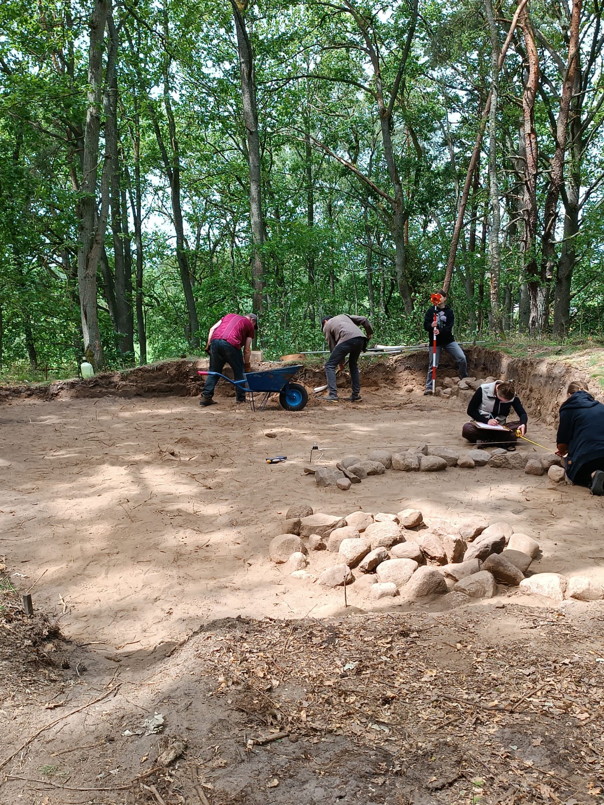 W lipcu 2025 roku najciekawszy okazał się obiekt uchwycony pod koniec poprzedniego sezonu, który nie został wówczas przebadany ze względu na brak czasu - piec o glinianych ściankach i podstawie wykonanej z dużych otoczaków. Czekał cały rok przykryty folią i zasypany ziemią. W jego wnętrzu natrafiono na zaledwie dwa fragmenty ceramiki, które najprawdopodobniej należy wiązać z kulturą wielbarską. Podobne konstrukcje znane są głównie z osad. Do wypalania czego służył piec i dlaczego ulokowano go na krawędzi cmentarzyska, pozostaje na razie zagadką. Być może na te pytania odpowiedzą wyniki badań specjalistycznych próbek, które zostały pobrane z obiektu.