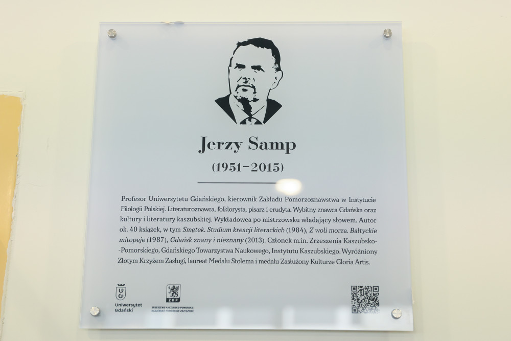 Na Wydziale Filologicznym UG odsłonięto tablicę pamiątkową prof. Jerzego Sampa oraz nadano jego imię auli 1.47. W uroczystości wzięli udział bliscy profesora - żona Barbara i syn Christian, przedstawiciele społeczności akademickiej UG, delegacja kaszubska oraz uczniowie ze szkół noszących imię wybitnego badacza kaszubskiej i pomorskiej kultury.
