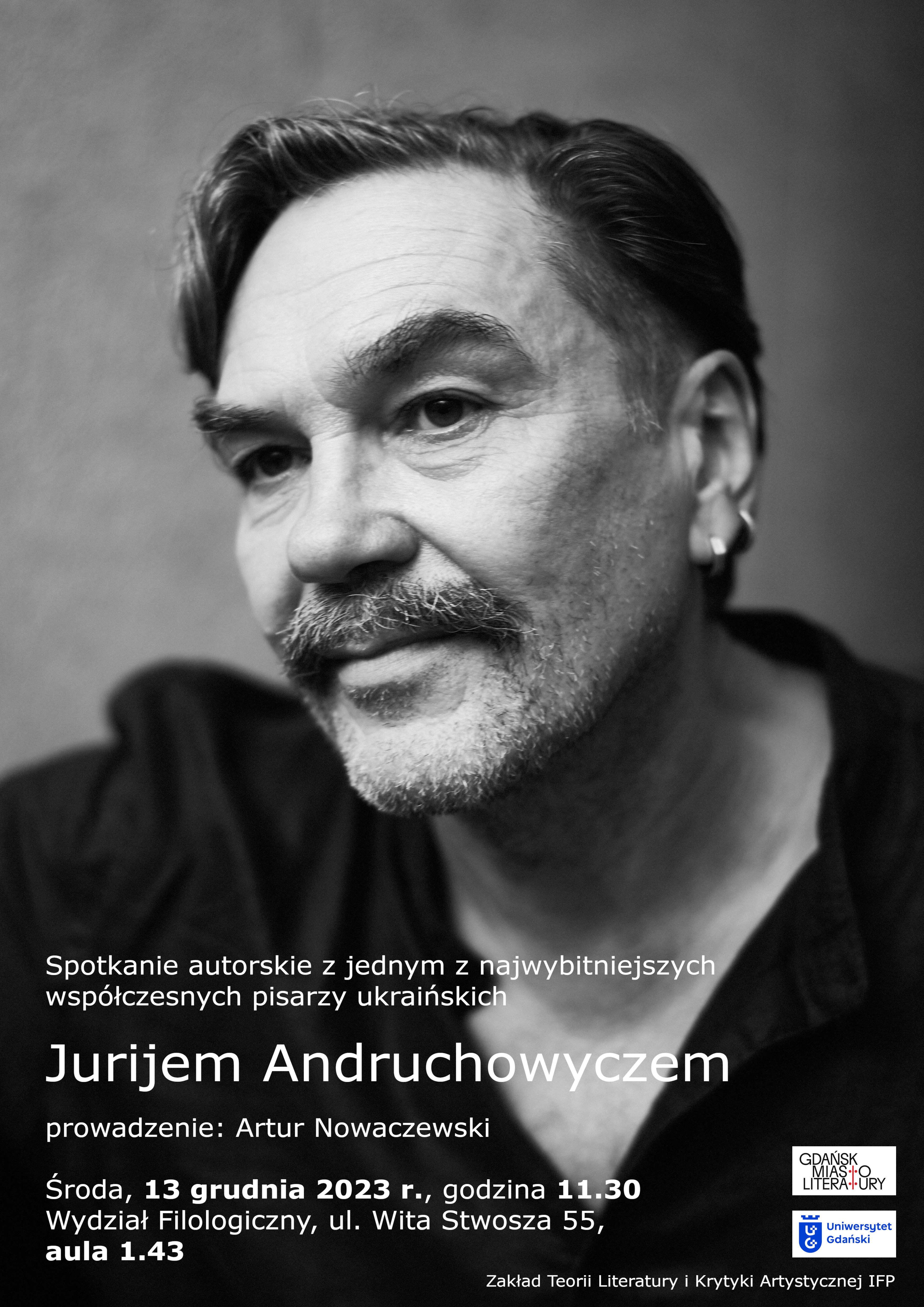 Instytut Filologii Polskiej Wydziału Filologicznego zaprasza na spotkanie z jednym z najbardziej znanych ukraińskich pisarzy Jurijem Andruchowyczem 13 grudnia o godz. 11.30, na Wydziale Filologicznym, ul. Wita Stwosza 55, aula 1.43. Spotkanie prowadzi dr hab. Artur Nowaczewski, prof. UG z Wydziału Filologicznego UG.