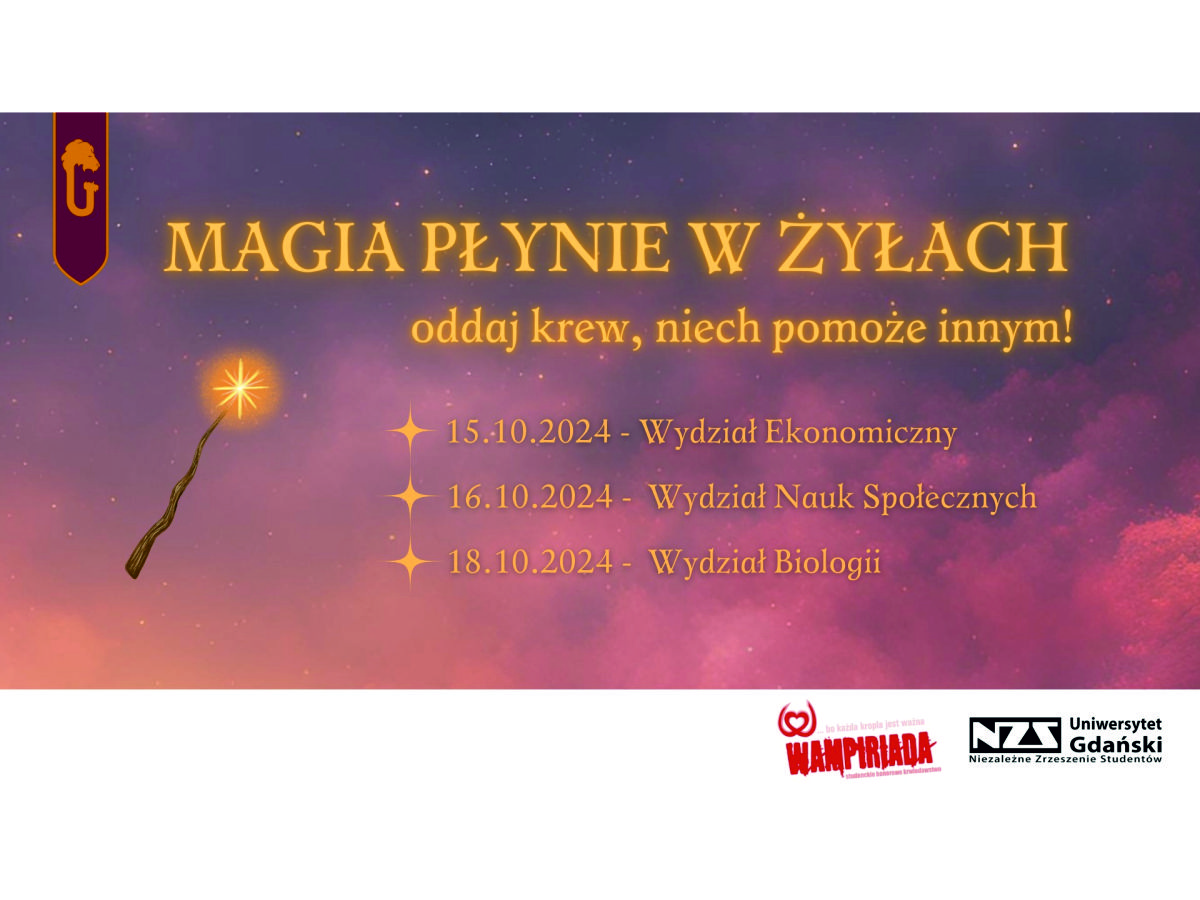 NZS UG ma zaszczyt zaprosić Was do wzięcia udziału w magicznej akcji krwiodawstwa, która odbędzie się w klimacie pełnym zaklęć, różdżek i dobroci!