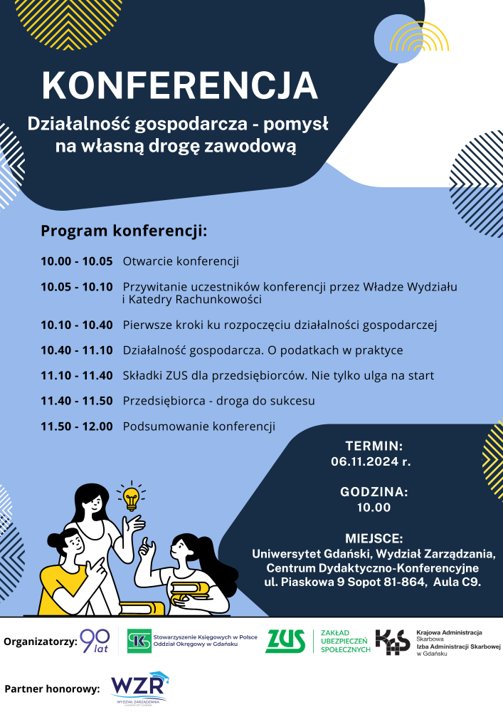6 listopada 2024 r. odbędzie się konferencja na temat "Działalność gospodarcza - pomysł na własną drogę zawodową" organizowana przez Stowarzyszenie Księgowych w Polsce pod patronatem Katedry Rachunkowości Wydziału Zarządzania.