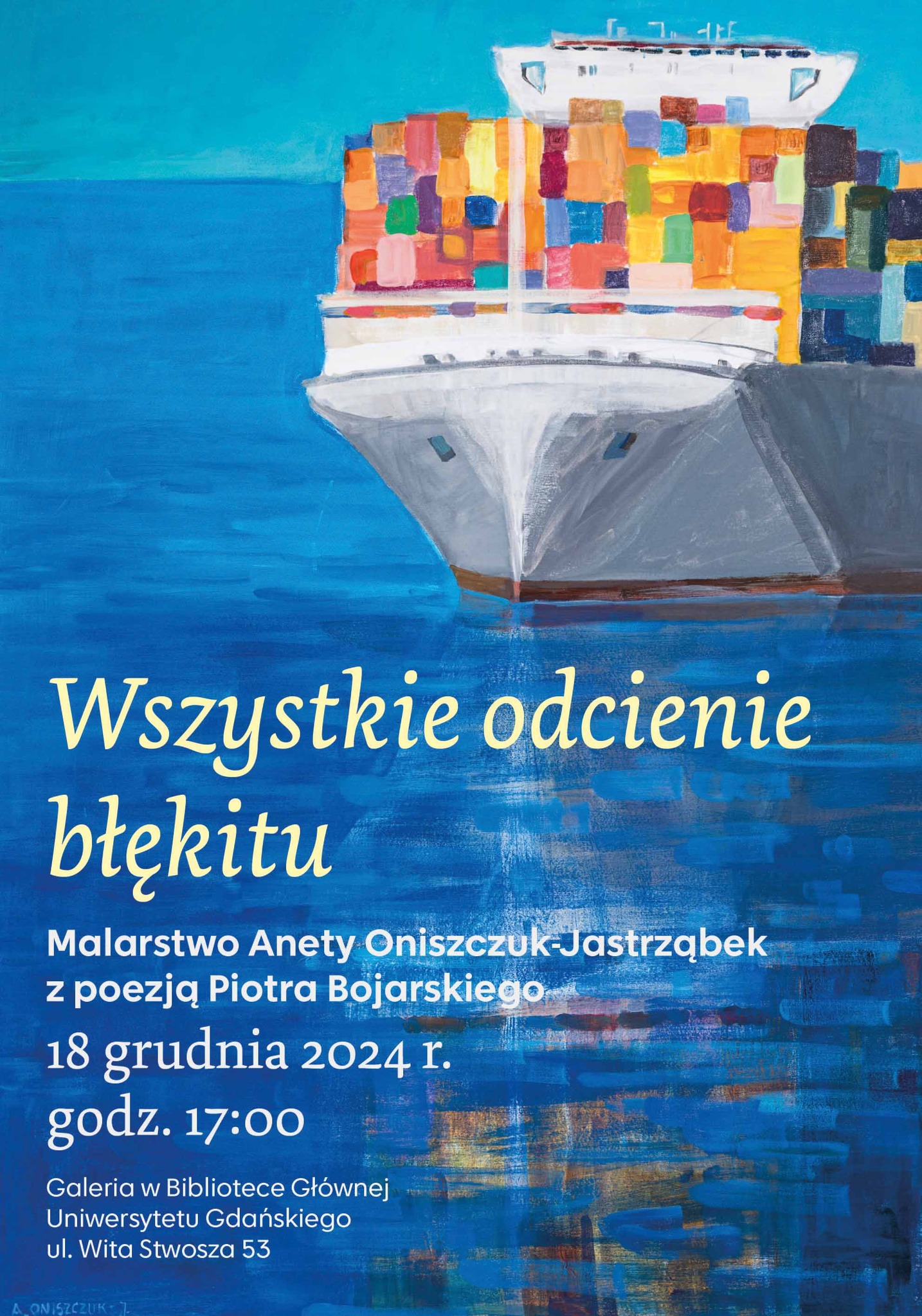 Zapraszamy na wyjątkowe spotkanie dwóch światów: malarstwa i poezji. Już 18 grudnia 2024 r. o godz. 17:00 w Galerii w Biblioteka Uniwersytetu Gdańskiego odbędzie się spotkanie pt. "Wszystkie odcienie błękitu", podczas którego zaprezentowane będą obrazy dr hab. inż. Anety Oniszczuk-Jastrząbek, prof. UG wspólnie z poezją prof. dr hab. Piotra Bojarskiego.