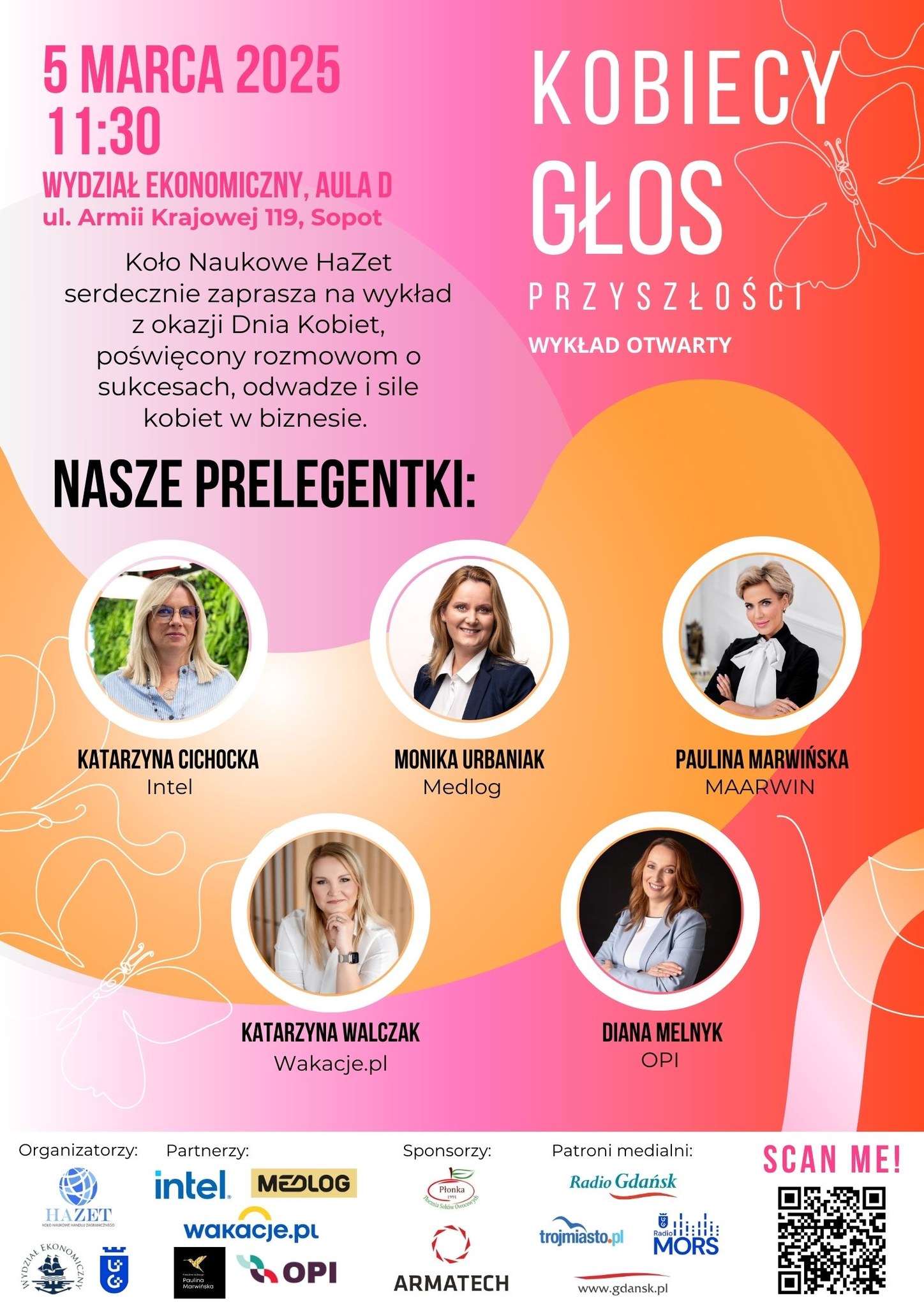 Koło Naukowe Handlu Zagranicznego UG HaZet zaprasza na wykład otwarty Kobiecy głos przyszłości z okazji Dnia Kobiet poświęcony rozmowom o sukcesach, odwadze i sile kobiecego działania