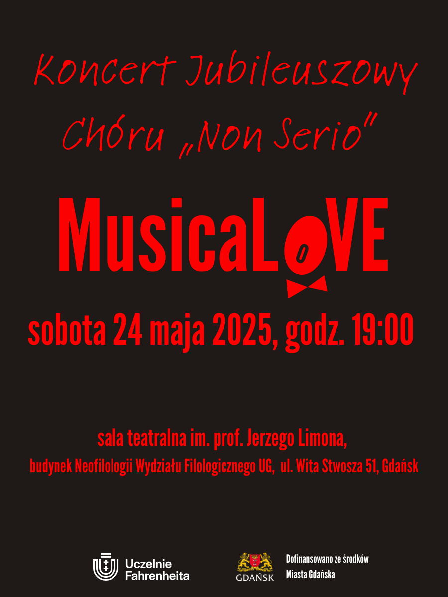 Chór „Non Serio” zaprasza na jubileuszowy koncert „MusicaLOVE” który odbędzie się w sobotę, 24 maja 2025, o godz. 19:00, w Sali Teatralnej im. prof. Jerzego Limona (budynek Neofilologii Wydziału Filologicznego UG, ul. Wita Stwosza 51, Gdańsk, kampus UG). Usłyszycie największe przeboje musicalowe, m.in. ze „Skrzypka na dachu”, „West Side Story”, „Króla Lwa”, „Jesus Christ Superstar” i „Chicago”. Chórowi pod batutą Beaty Borowicz towarzyszyć będzie na fortepianie Bartłomiej Łyziński.