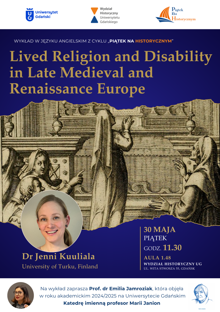 Dziekan WH dr hab. Arkadiusz Janicki, prof. UG oraz Prof. dr Emilia Jamroziak z University of Leeds zapraszają na wykład pt. „Lived Religion and Disability in Late Medieval and Renaissance Europe”, który wygłosi Dr Jenni Kuuliala z University of Turku, Finland.