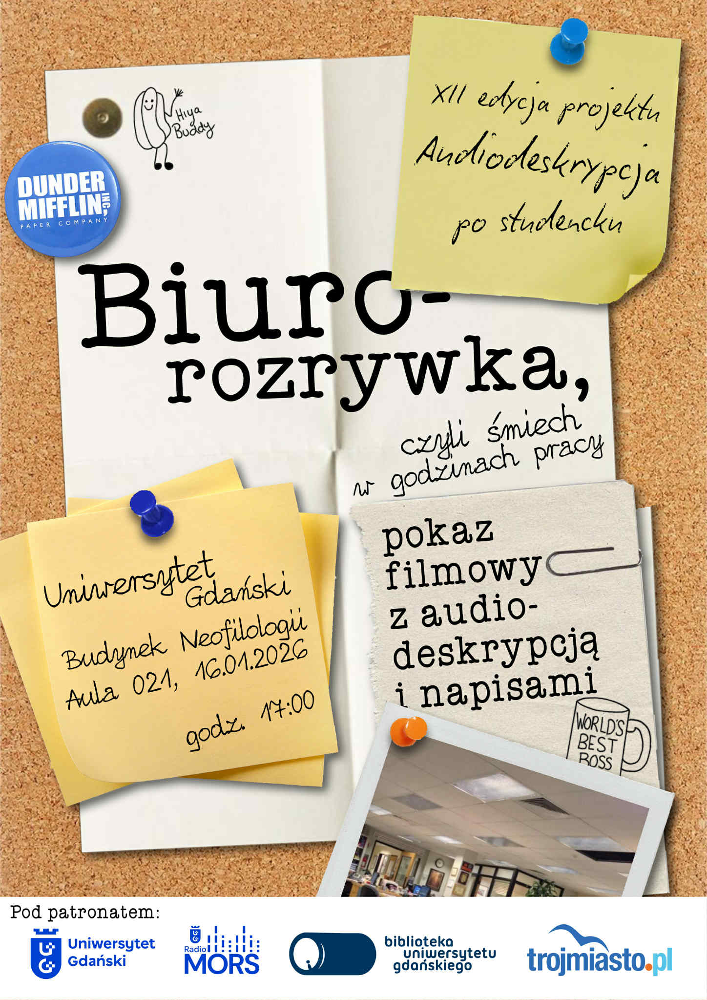 Studenci drugiego roku studiów magisterskich filologii angielskiej zapraszają na wyjątkowe wydarzenie, łączące humor kultowego amerykańskiego serialu „Biuro” ('The Office') z ideą inkluzywności! W ramach projektu „Audiodeskrypcja po studencku” studenci przygotowali polskie tłumaczenie dwóch odcinków serialu w formie napisów oraz stworzyli audiodeskrypcję, dzięki czemu osoby niesłyszące i słabo słyszące oraz osoby niewidome i słabo widzące będą mogły w pełni cieszyć się projekcją. Pokaz specjalny odbędzie się 16 stycznia 2026 o godz. 17:00 w budynku Neofilologii.