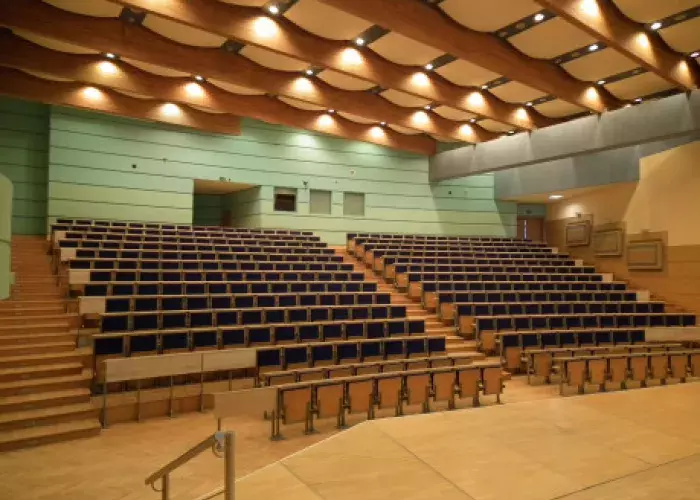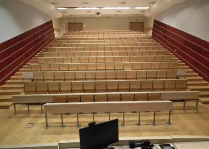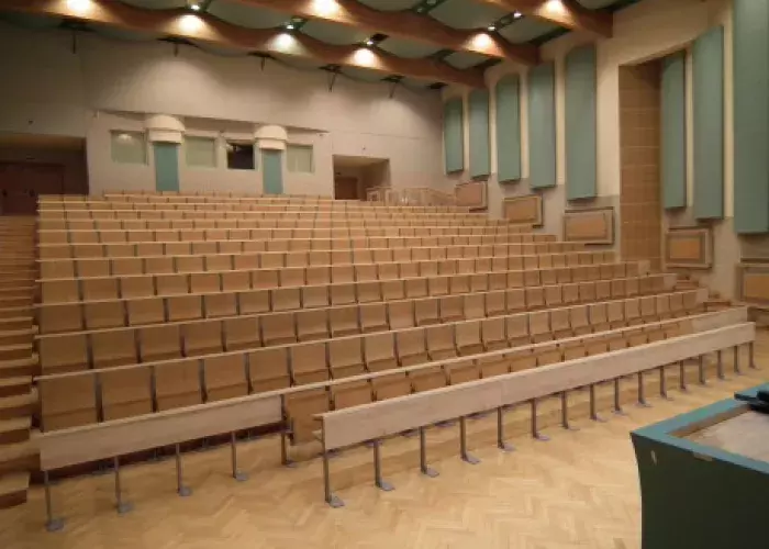 Pomieszczenie dwukondygnacyjne (wejście z parteru oraz z poziomu pierwszego piętra) z 200 miejscami siedzącymi w układzie kaskadowym. W audytorium znajduje się wyposażenie multimedialne: komputer, rzutnik multimedialny, system nagłośnienia. Częścią sali jest podest i ustawiony na nim niemobilny stół prezydialny oraz mównica.