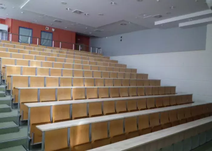 Pomieszczenie dwukondygnacyjne (wejście z parteru oraz z poziomu pierwszego piętra) z 300 miejscami siedzącymi umieszczonymi kaskadowo. W audytorium znajduje się wyposażenie multimedialne: komputer, rzutnik multimedialny oraz system nagłośnienia. Częścią pomieszczenia jest podest i ustawiony na nim niemobilny stół prezydialny, oraz mównica.