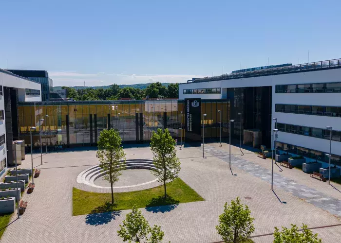 Przestronna aula audytoryjna o powierzchni 103,71m² przeznaczona dla 96 osób. Pomieszczenie z dwoma wejściami, z miejscami dla osób z niepełnosprawnościami na wózkach. Aula wyposażona jest w sprzęt multimedialny: komputer, rzutnik multimedialny, system nagłośnienia. Ustawiona na podeście katedra z mównicą umożliwia zajęcie miejsca czterem osobom. Za katedrą znajduje się zespół przesuwnych zielonych tablic akademickich. Komfort uczestników wykładów zwiększa precyzyjny system klimatyzacji i wentylacji oraz elektrycznie sterowane rolety okienne.