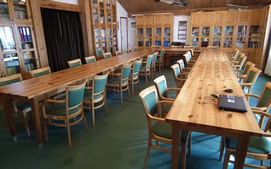 Sala dydaktyczna w budynku głównym Stacji Morskiej im. Prof. Krzysztofa Skóry to bardzo klimatyczne pomieszczenie, wyposażone w sprzęt niezbędny do przeprowadzenia prezentacji lub szkolenia. Do Państwa dyspozycji jest laptop oraz rzutnik multimedialny. Układ stołów w kształt litery U zapewnia 34 wygodne miejsca dla uczestników spotkania.