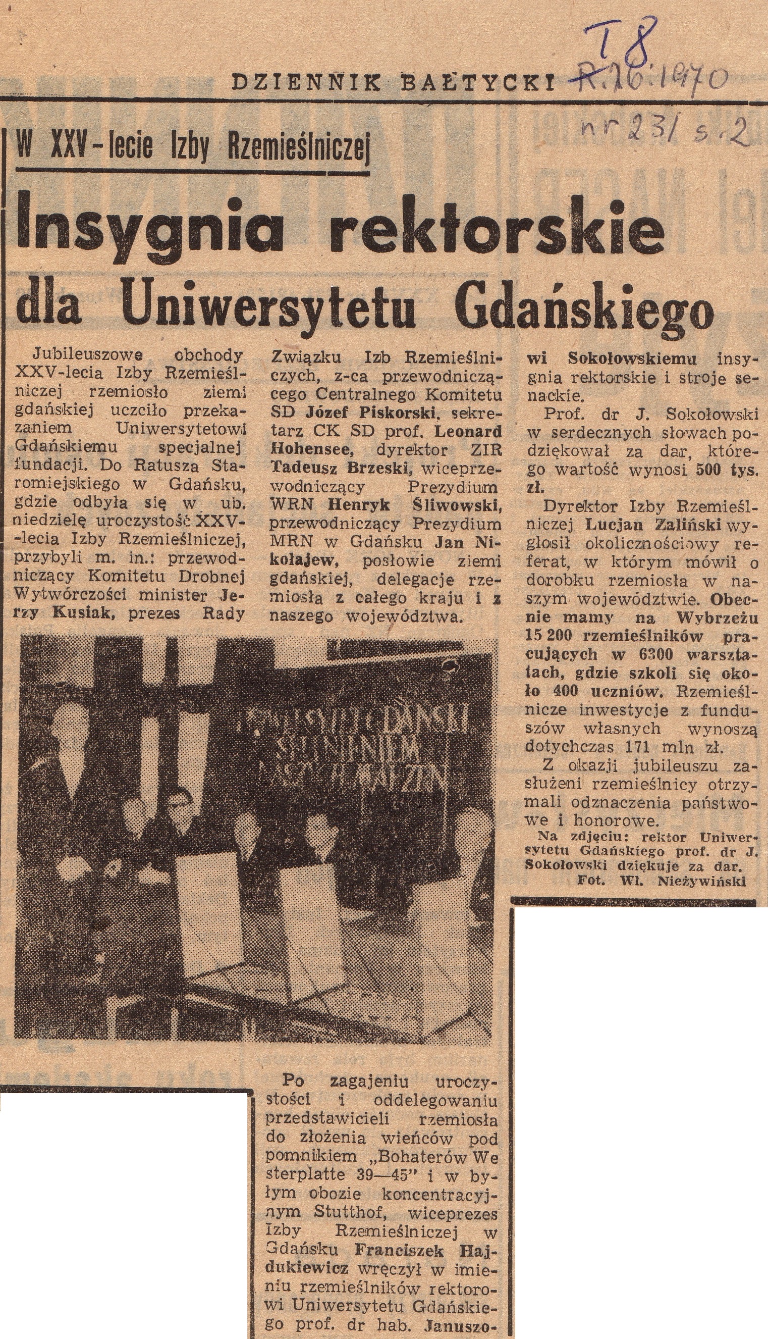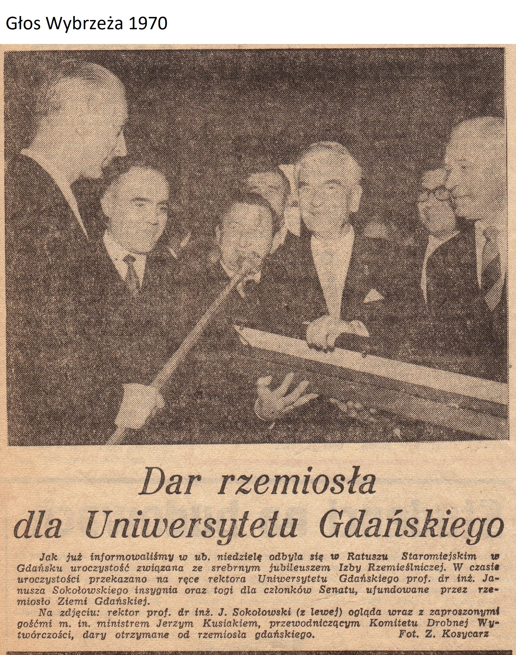 The craftsmanship of Gdańsk in its more than a thousand-year history has always been closely connected with its city. The decision to establish the University of Gdańsk was welcomed by the craftsmen with the declaration that they would fund insignia for the rectors and deans and uniforms for the senate. On the eve of the inauguration of the first academic year at the University of Gdańsk, the final moment will take place - the handing over of the foundation to the university authorities.