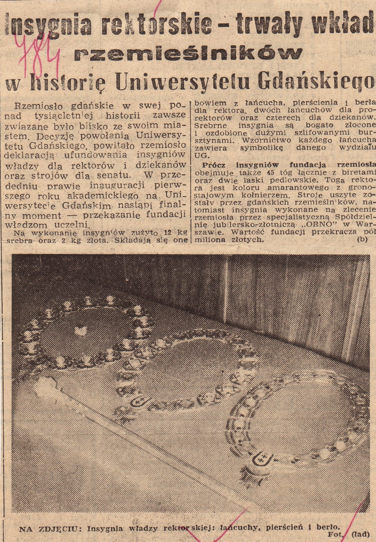 In addition to the insignia, the craftsmanship foundation also includes 45 togae including birettas and two sceptres. The rector's toga is amaranth in colour with an ermine collar. The costumes were sewn by Gdańsk craftsmen, while the insignia were made to order by a specialist jewellery and goldsmiths cooperative "ORNO" in Warsaw. The value of the foundation exceeds half a million zlotys.
