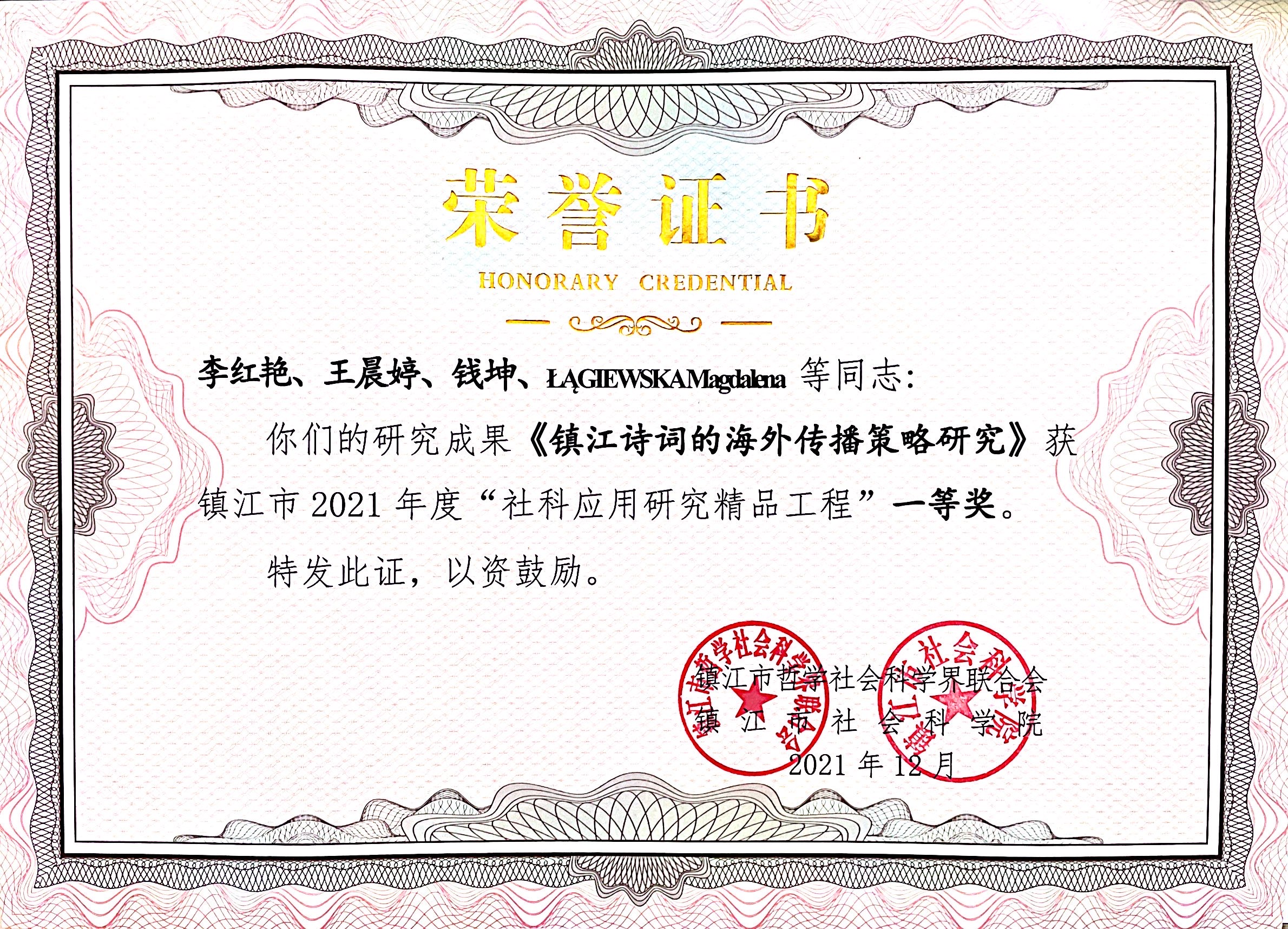 - The research project was not only of academic value, but also of high practical value, and thus gained recognition. The Academy of Social Sciences of Zhenjiang City awarded you the first prize for an excellent project in applied research in social sciences.