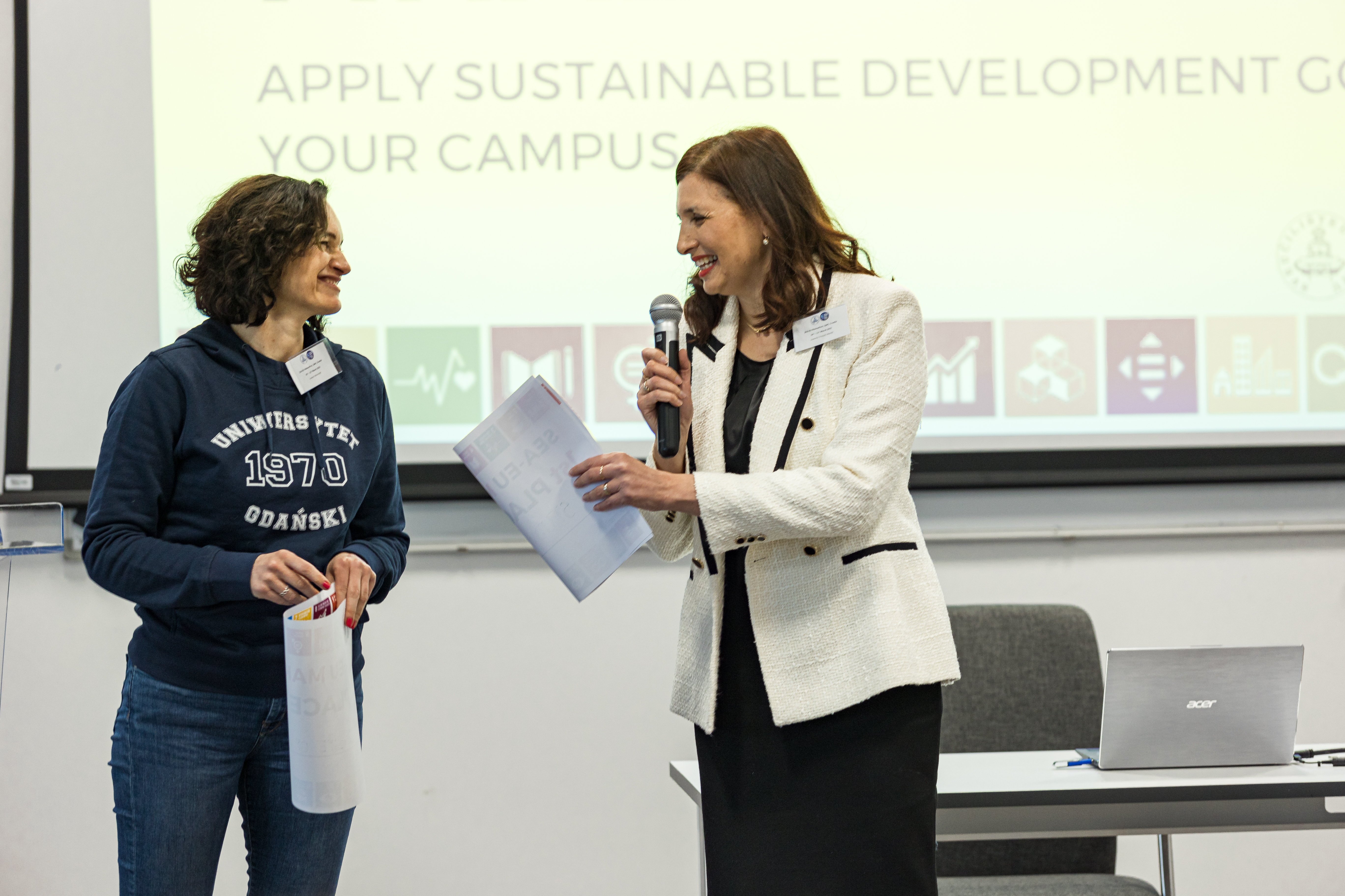 Our students, after many hours of preparation, stood up to compete with five other teams. The jury evaluated five-minute presentations in English. In this short time, they had to show the validity of the solution, which above all should fit into at least one of the 17 objectives of sustainable development.