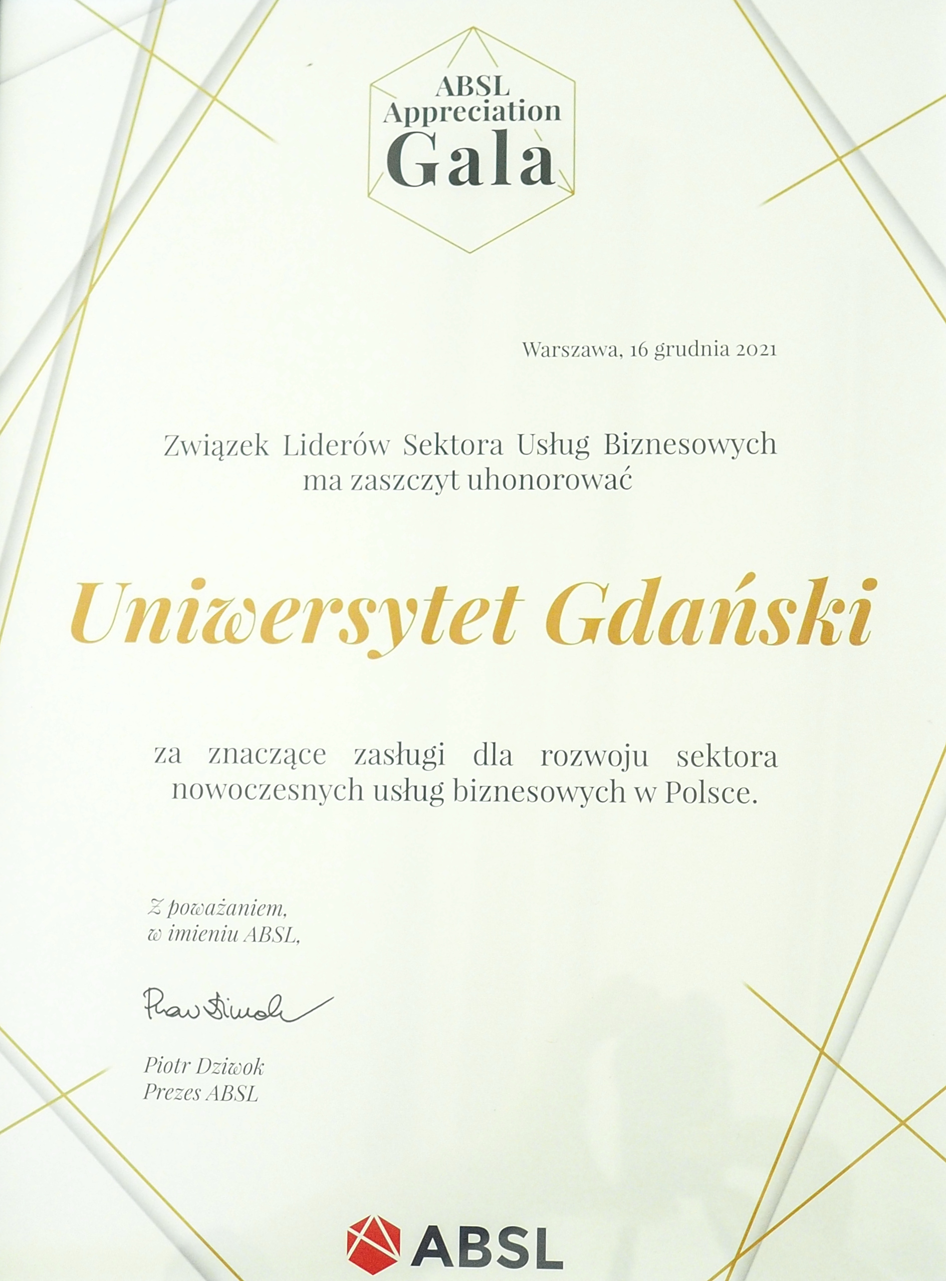 The University of Gdańsk has been honoured by the Association of Business Service Leaders (ABSL) in the 'Education Leaders' category. It is an award granted for significant contributions to the development of the modern business services sector. ABSL Gala is held once every two years. This year the Association of Business Service Leaders presented 49 awards in ten categories.