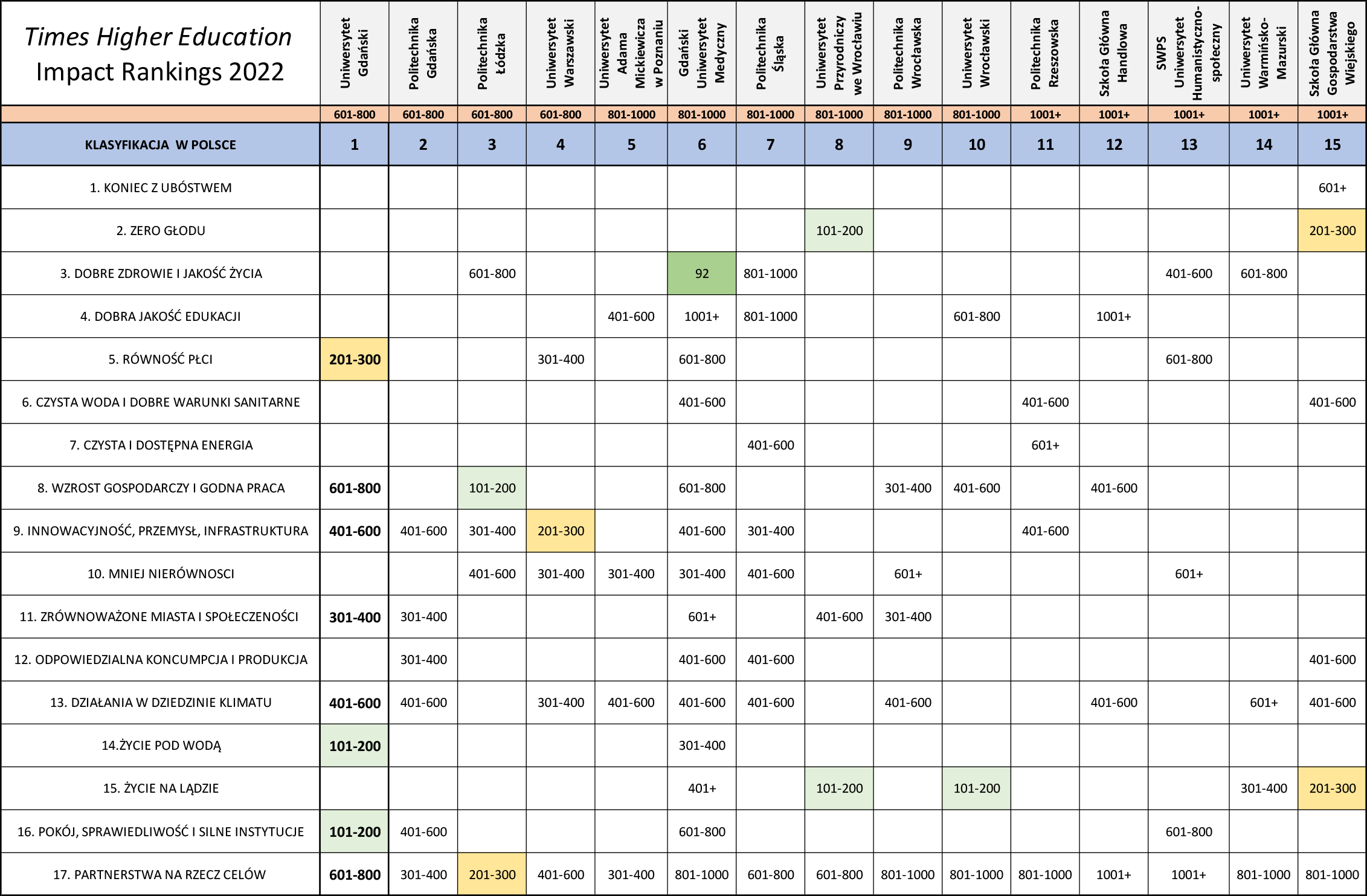 The results of Polish universities in THE Impact Ranking 2022 are presented in the attached table: