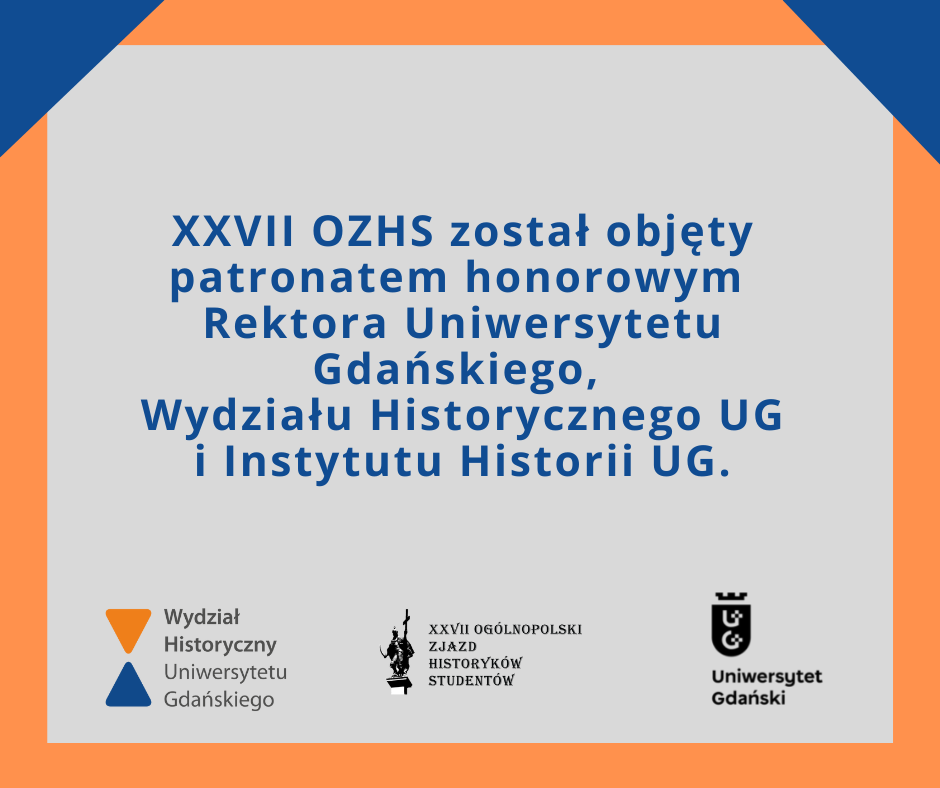 The National Congress of Student Historians is an extraordinary event. The tradition of student meetings has been maintained over the years. During five days, from May 9 to 13, 2022, several dozen talks will be delivered. The organisers have prepared an extremely interesting programme. It is a great celebration for the entire community, an opportunity to get to know each other better and to exchange experiences. The XXVII OZHS in Warsaw has received honorary patronage of the Rector of the University of Gdańsk, the Faculty of History of the University of Gdańsk and the Institute of History of the University of Gdańsk. The event was co-organised by the University of Gdańsk History Doctoral Students' Association and the University of Gdańsk Historians' Association.