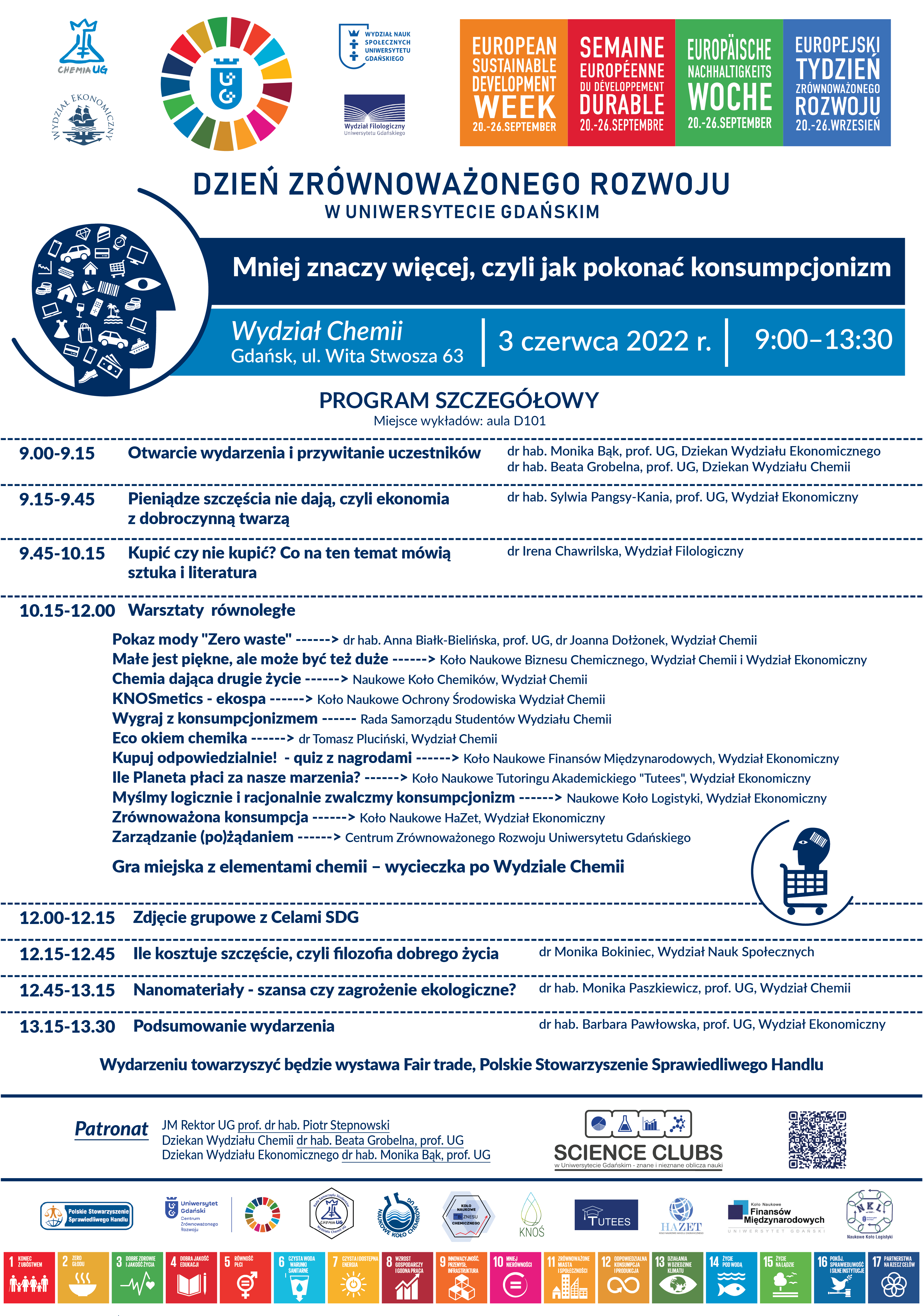 The waste of natural resources, the destructive influence on the human spiritual sphere, the perception of human value solely by what one possesses - these are just some of the sins of consumerism. Raising environmental awareness and shaping pro-ecological attitudes among students, employees and the environment is in the interest of all of us. In response to the increasingly visible problems of nature, the UG Chemistry Department is organising a Sustainable Development Day on June 3rd.