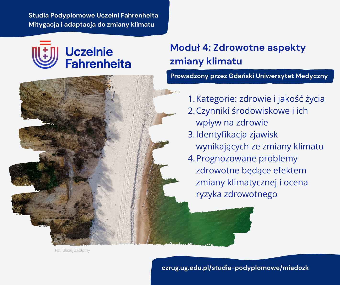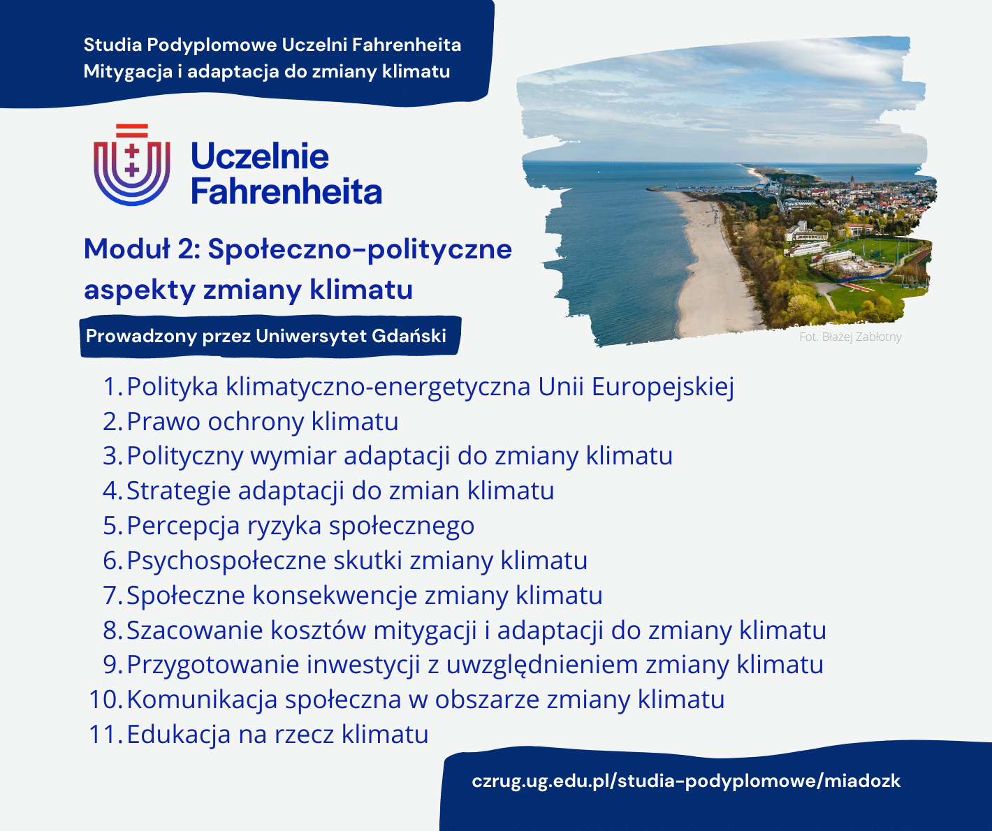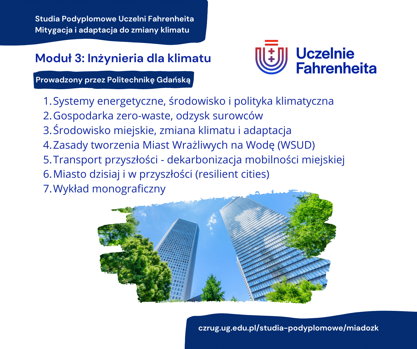 Climate change is such a universal challenge that it forces almost all actors to work together. For example, urban design requires environmental and climate education and the ability to coordinate the activities of various institutions, companies and organisations. In response, among other things, to such challenges, the Fahrenheit Universities' Postgraduate Studies in Mitigation and Adaptation to Climate Change were established as a joint initiative of the Fahrenheit Universities, namely the University of Gdańsk, the Technical University of Gdańsk, and the Medical University of Gdańsk: