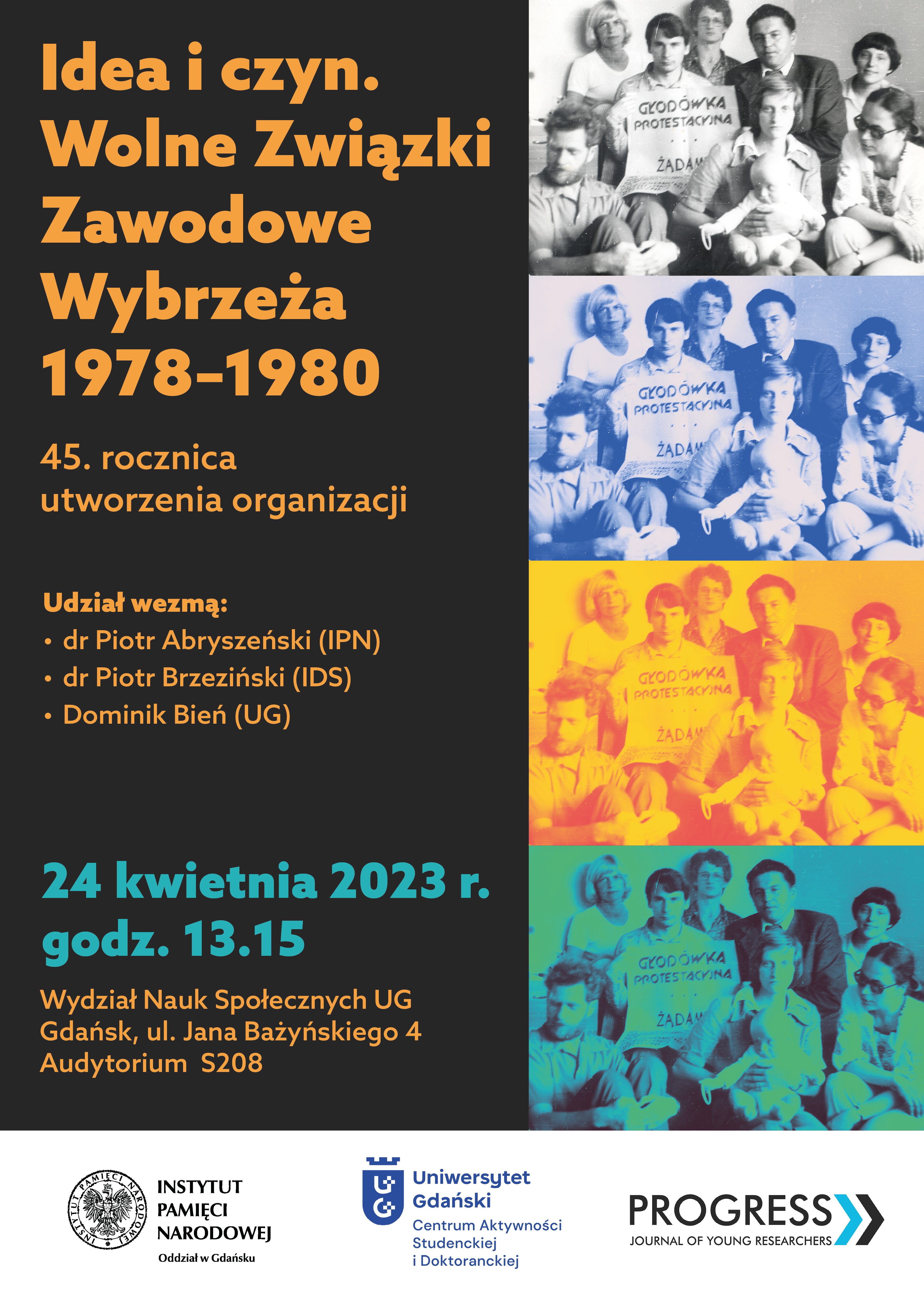 The Centre for Doctoral and Student Activities of the University of Gdańsk invites you to participate in a meeting related to one of the most important organisations of the pre-August opposition - the Free Trade Unions of the Coast. The occasion for the conference is the 45th anniversary of the organisation. The event will be attended by: dr Piotr Abryszeński (Institute of National Remembrance), dr Piotr Brzeziński (Solidarity Heritage Institute), and Dominik Bień (University of Gdańsk). The meeting will take place on April 24 at 1.15 p.m. in auditorium S208 at the Faculty of Social Sciences.