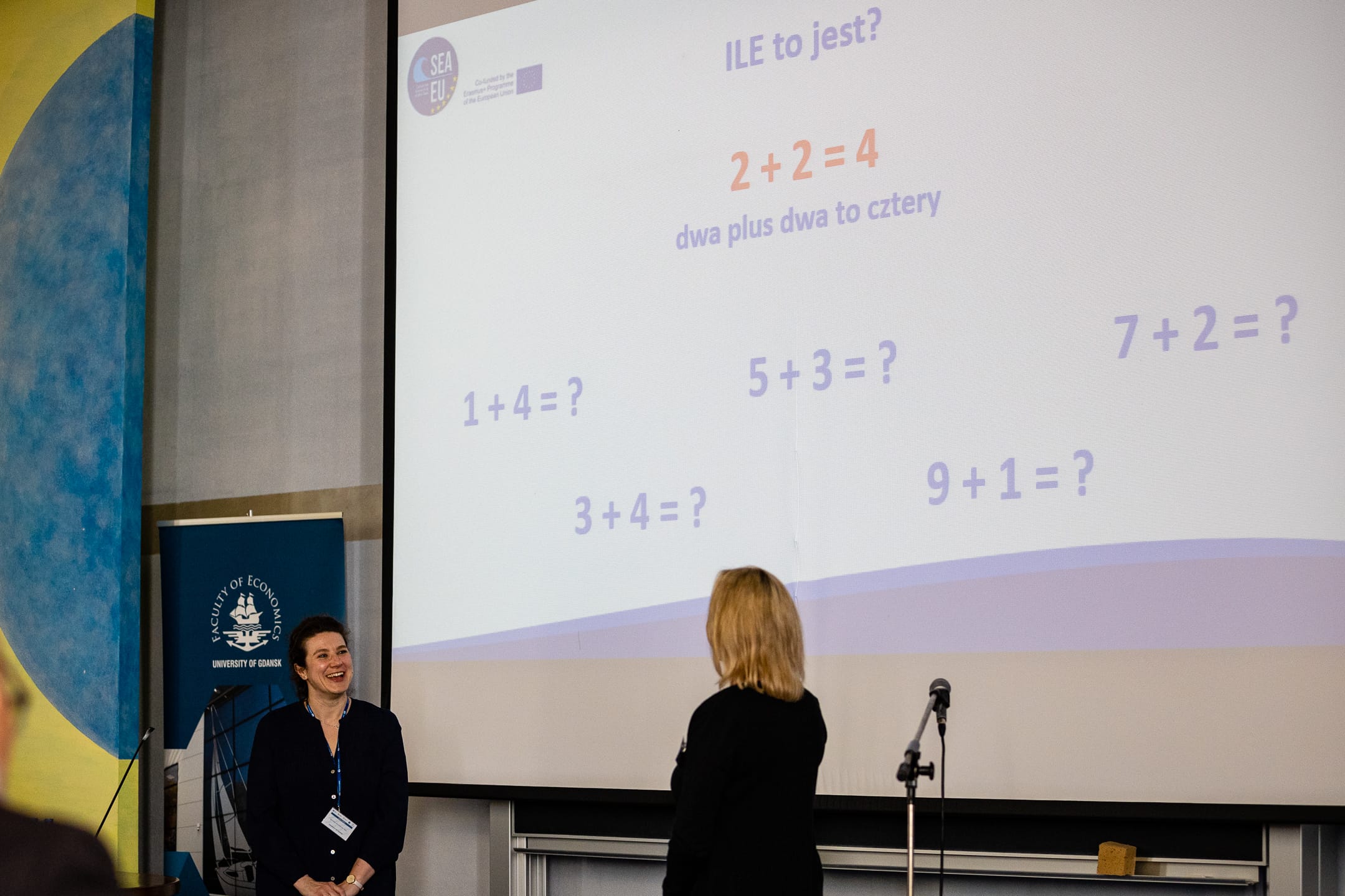 The second day of the conference was opened by the Dean of the Faculty of Economics, dr hab. Monika Bak, prof. UG. Afterwards, the participants were invited to a crash course in Polish language and networking, conducted by CJO UG lecturers: Renata Korzeniowska, Monika Gawin and dr Agnieszka Wysomierska-Tkacz. The students learnt how to introduce themselves in Polish, how to count, and how to use basic phrases such as thank you, sorry, I don't understand, bless you or help.