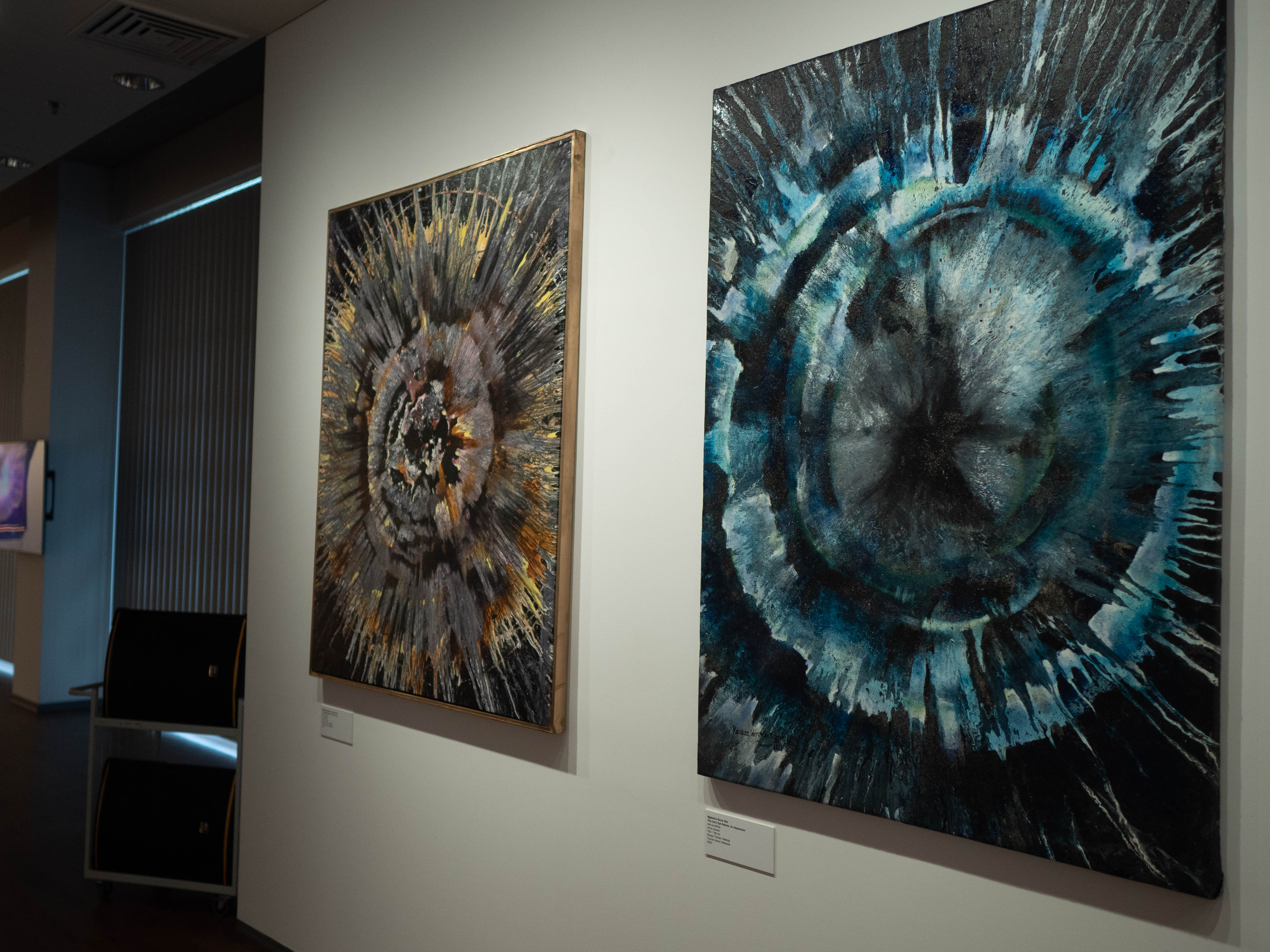 Due to the subject matter of the Secrets of the Stars series, the exhibition space was prepared differently than before. In the darkened room, space graphics made of translucent material hang from the ceiling. On the walls, as the only illuminated elements in the room, are paintings by dr Karolina Wojnowska-Paterek. The new exhibition at BUG UG features works with titles such as Travels of Light and The Cat's Eye Nebula.