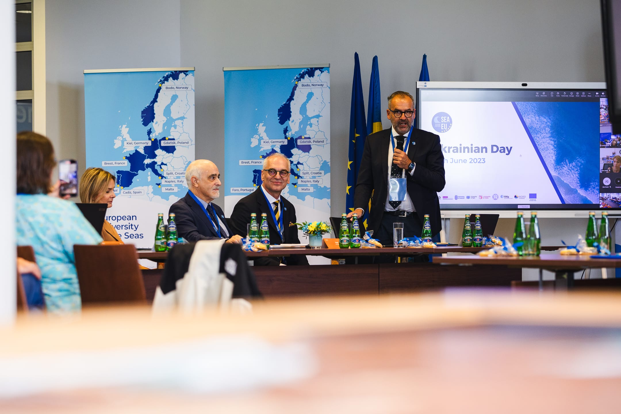 In the next part of the meeting, each partner university presented their institution together with its actions and initiatives taken towards supporting Ukraine. First to present was Odesa I. I. Mechnikov National University, represented by eight scientists led by professor Andriy Smityukh, Vice-Rector for Scientific and Pedagogical Work and International Cooperation. University of Cádiz, Spain, was introduced by Javier Izquierdo, University of Western Brittany, France, by Delphine Muths, Christian Albrecht University of Kiel, Germany, by Martina Schmode, The University of Gdańsk by Arnold Kłonczyński, University of Malta by Stefania Agius Fabri, University of Algarve, Portugal, by Patricia Pinto, and Nord University, Norway, by Elena Emilova Popova.