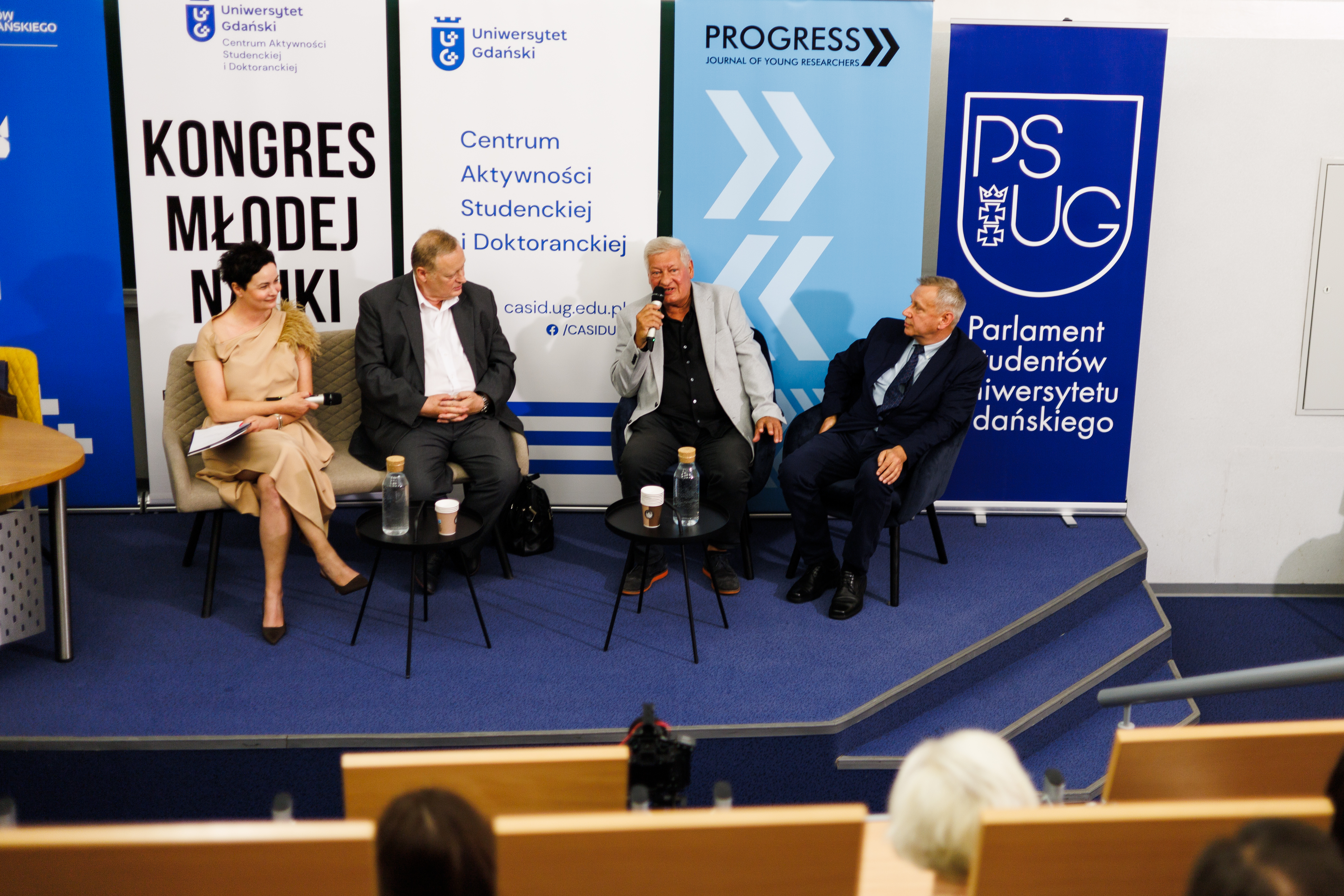 Participants in the discussion on funding problems and legal and administrative solutions in science included prof. dr hab. Grzegorz Węgrzyn, Chairman of the Council for Scientific Excellence, prof. dr hab. Bernard Lammek, Senior Rector of the UG, and prof. dr hab. Maria Mendel, Chairman of the Faculty of Social Sciences and Humanities of the Gdańsk Science Association.