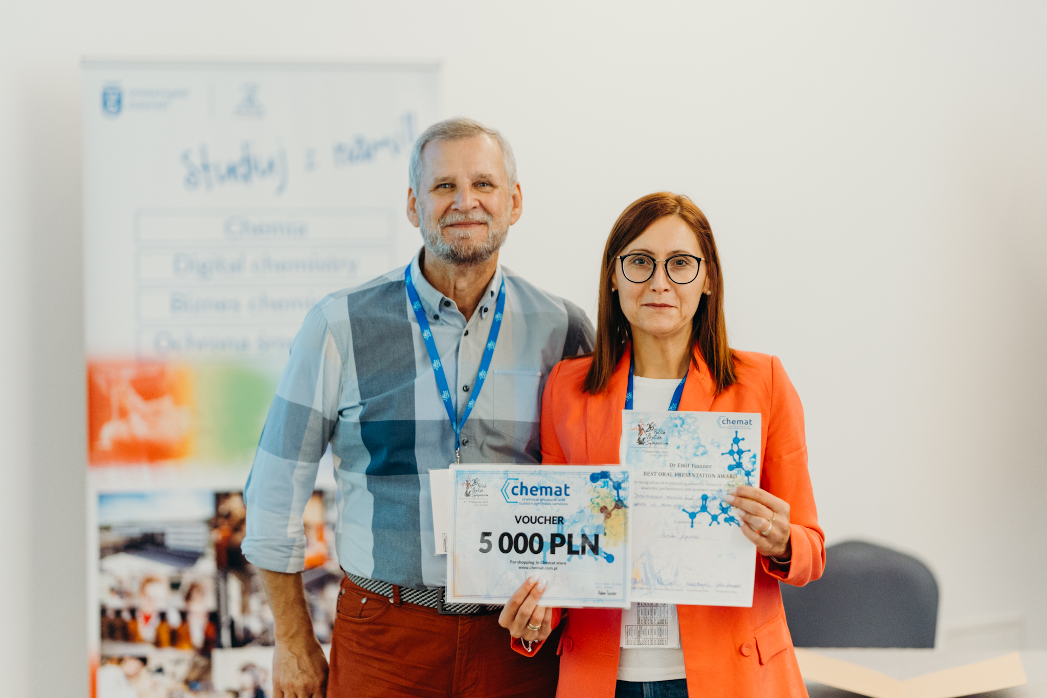 We are pleased to announce that the first Dr. Emil Taszner Prize for the best oral presentation for doctoral candidates, funded by the Chemat company, was established and awarded during the meeting. This year's prize winner was dr Monika Kijewska from the University of Wrocław for her presentation 'Intramolecular reversible and irreversible stapling of peptides via boron-sugar interaction'.