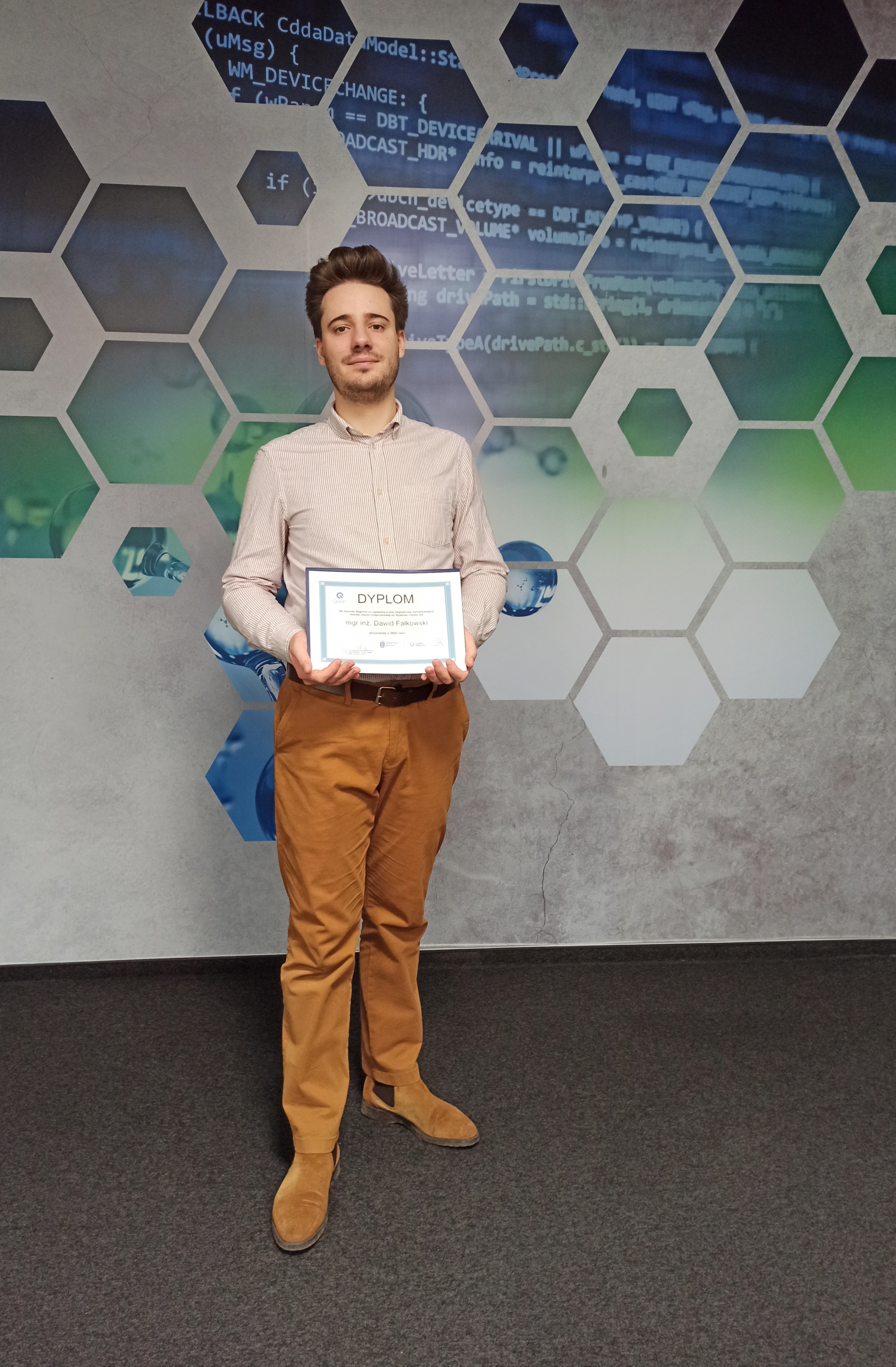 For the thesis entitled. 'Prediction of cytotoxicity of titanium dioxide nanoparticles modified with noble metals using computer methods', mgr. inż. Dawid Falkowski received an award funded by the QSAR Lab company. The award is given annually for the best master's thesis using computer chemistry methods.