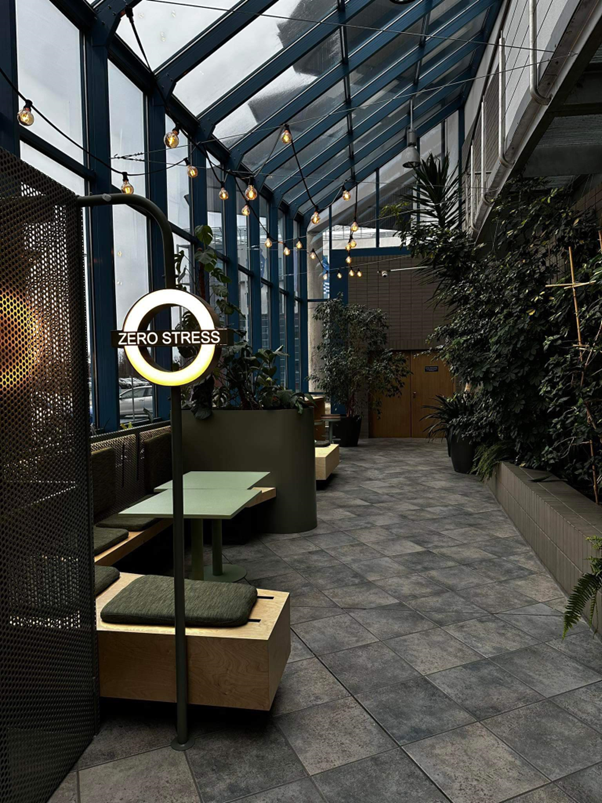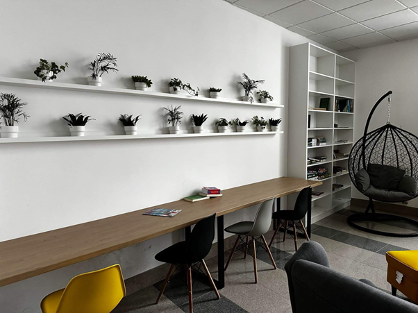 The revitalisation of the green plant area, together with the construction of new modular furniture in addition to a place for reading books and studying, creates the conditions for official or casual meetings. The design of this sector also visually enhances the space, improves the acoustics and lighting, and thus the well-being of people in the ZERO STRESS zone.