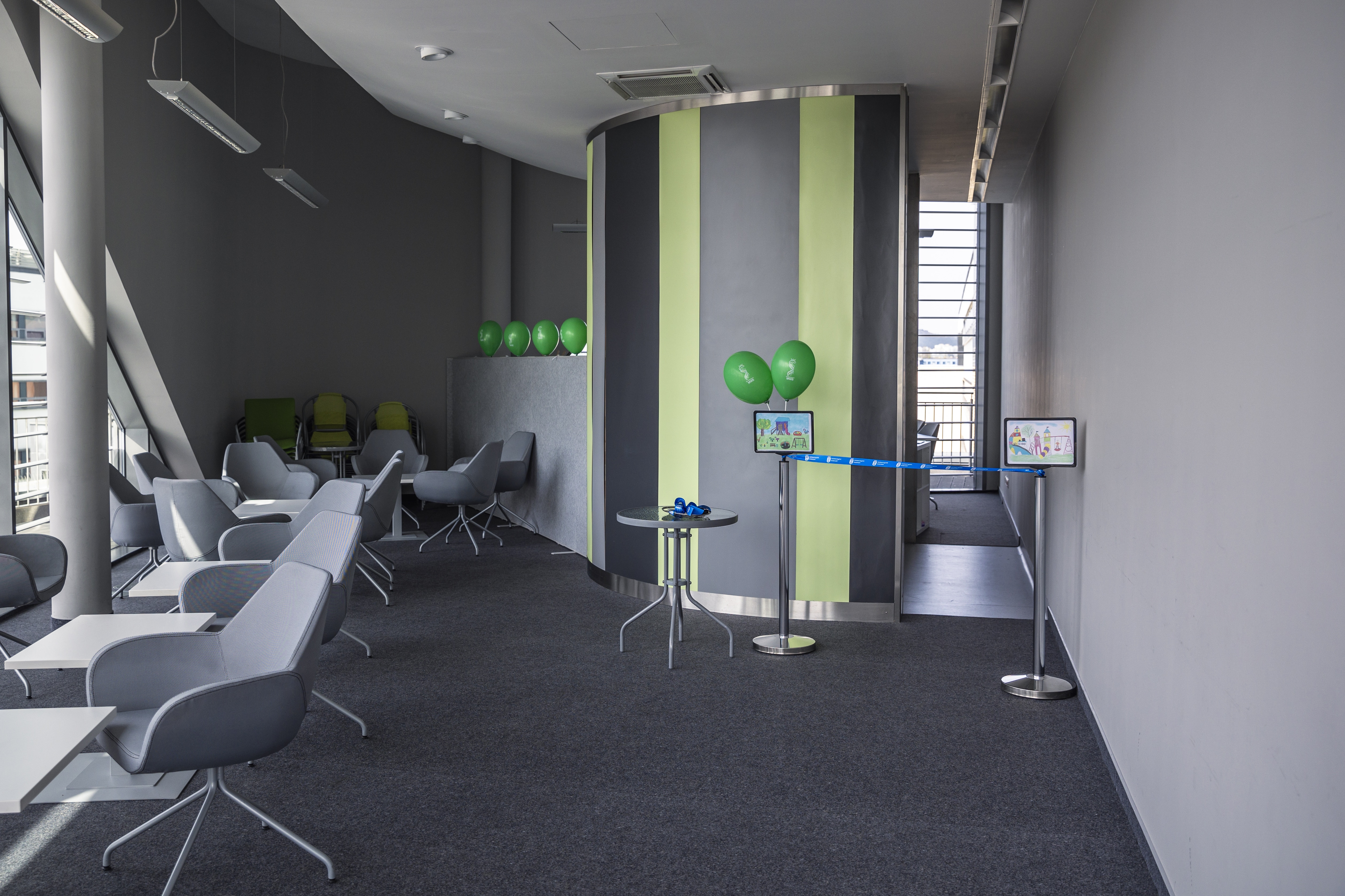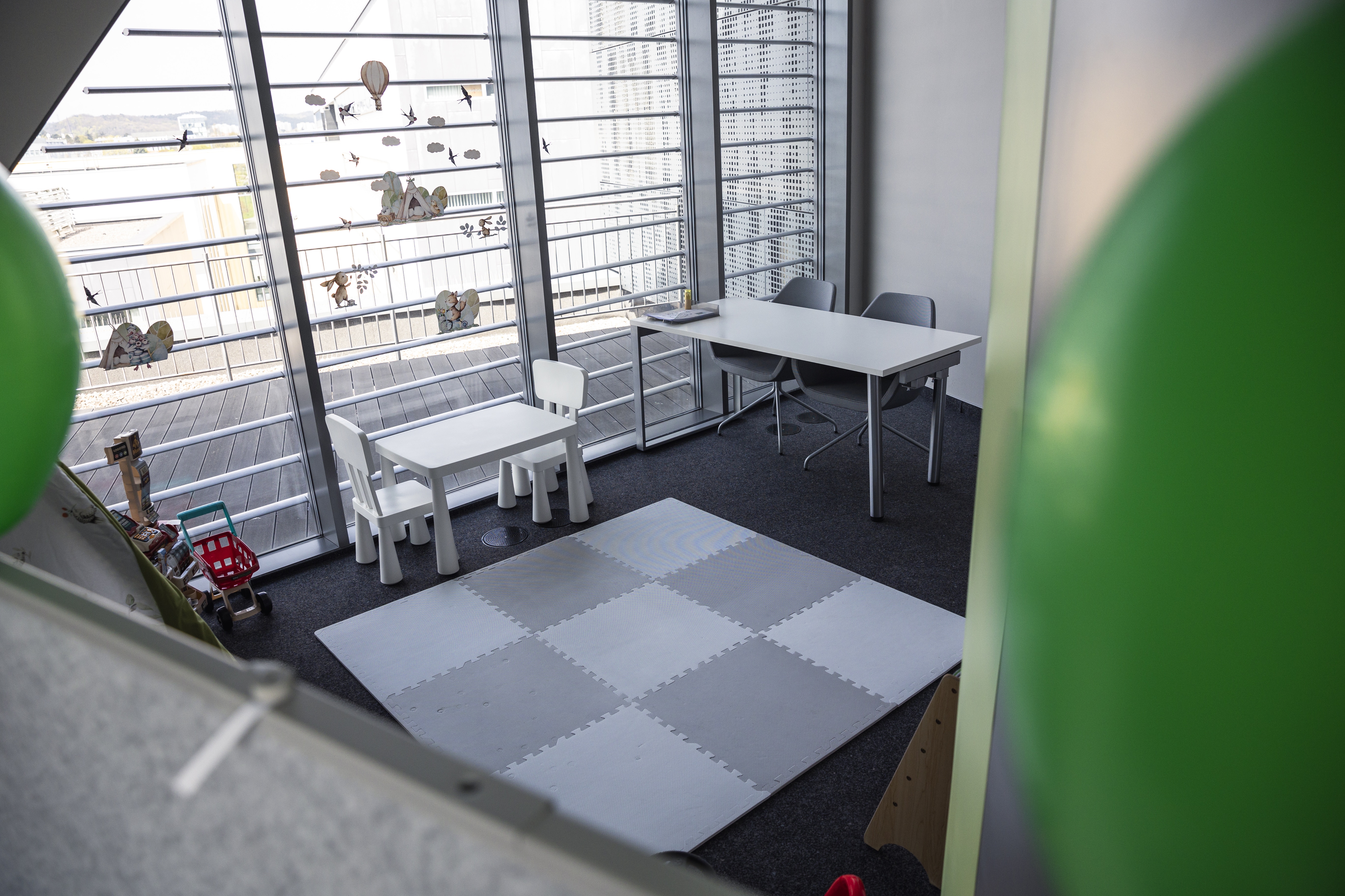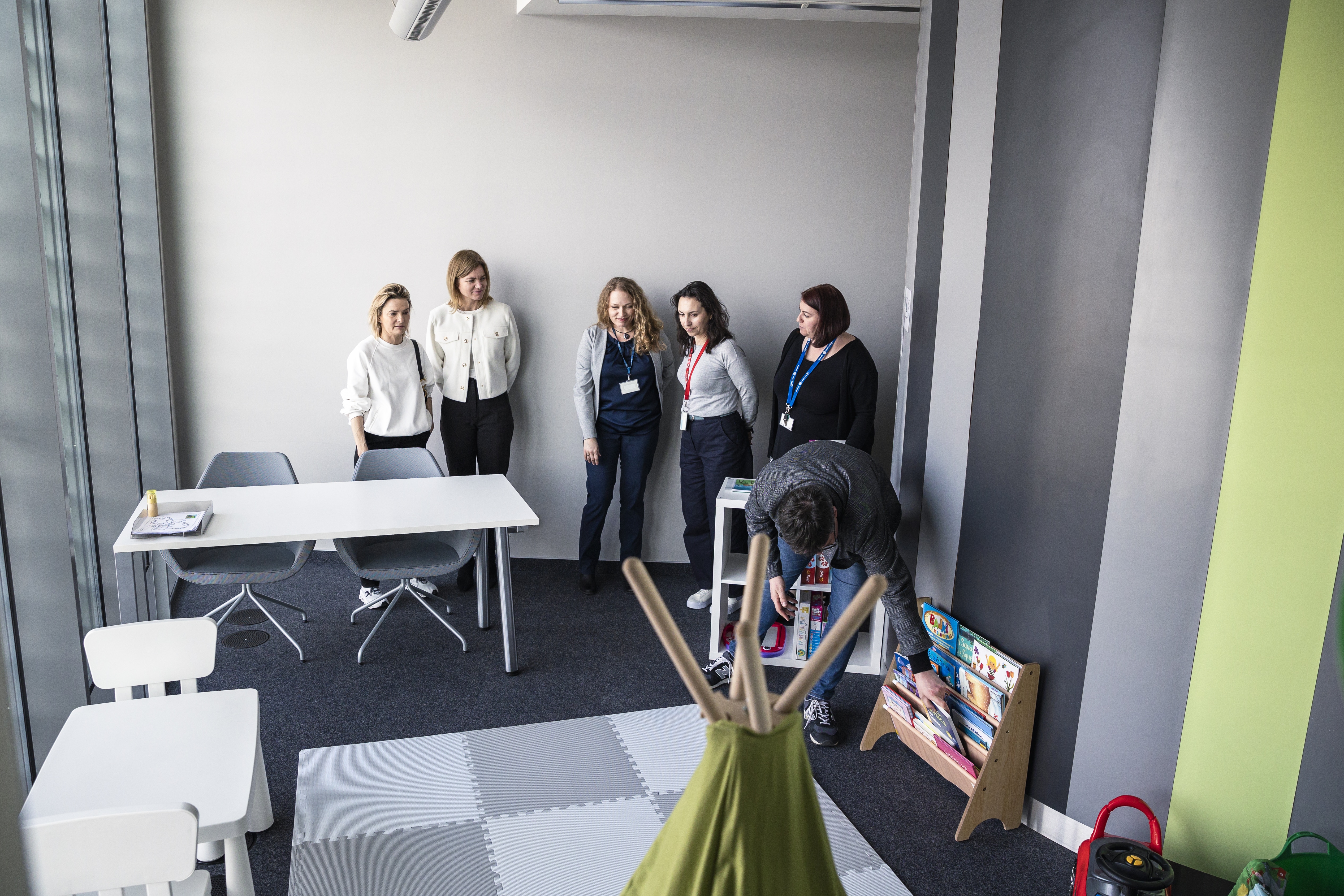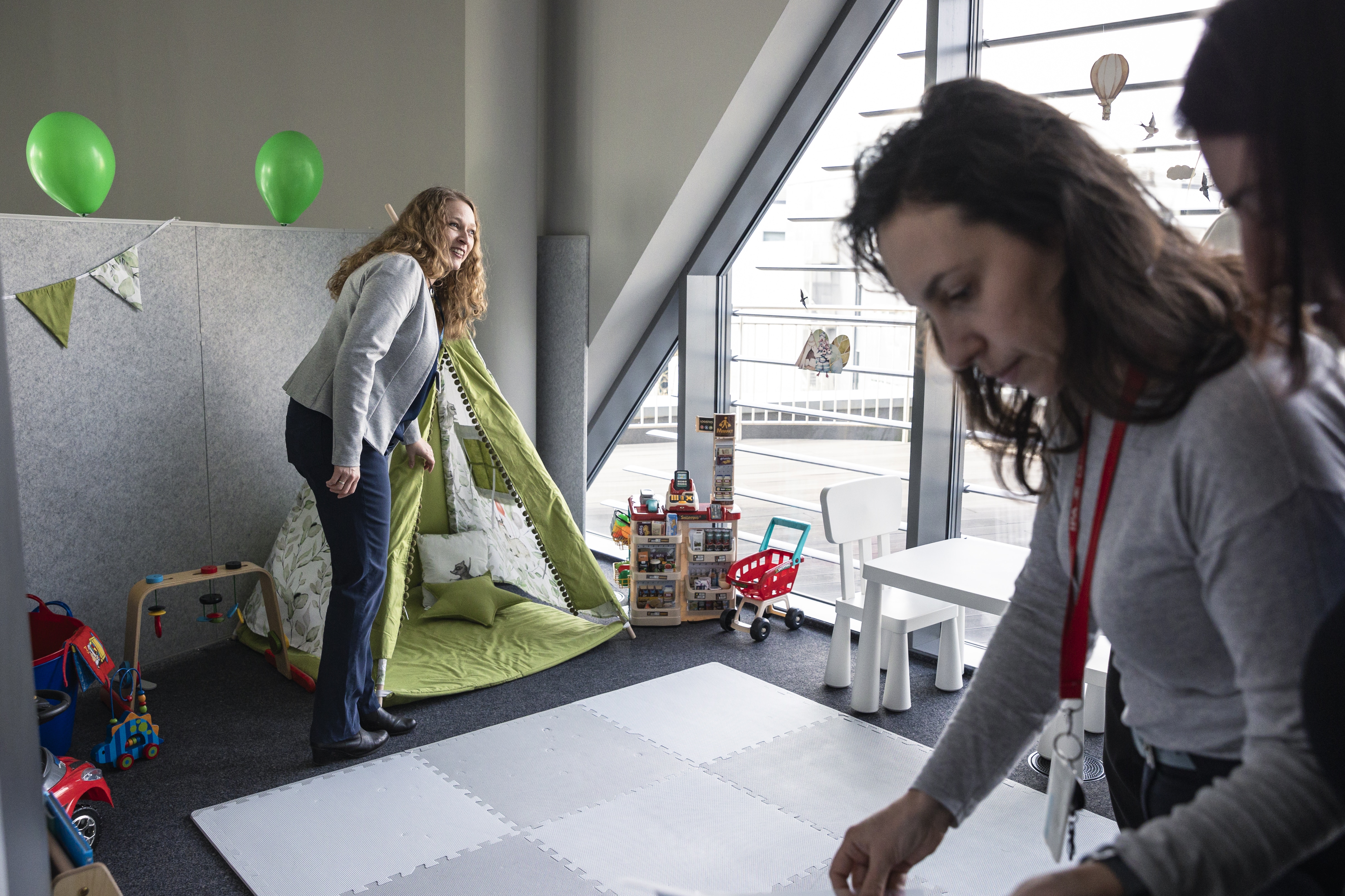 The corner will provide a safe and engaging play area for children of staff, doctoral students, and students, enabling parents and carers to work quietly at the desk installed within it or to attend meetings in the adjacent social room area.