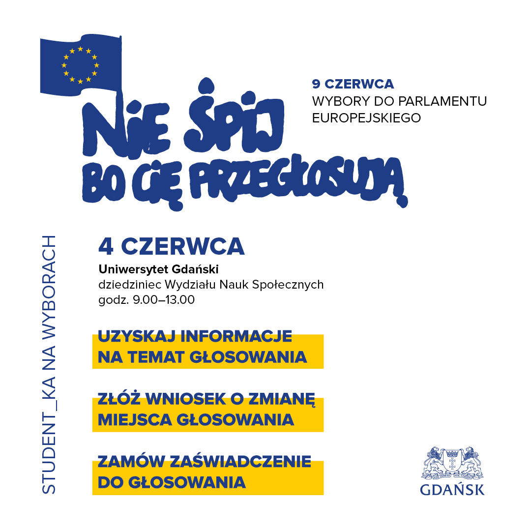 Elections to the European Parliament will be held on Sunday, June 9. Today, until 1:00 p.m. in the courtyard in front of the Faculty of Social Sciences, you can change your voting location and collect your voting certificate. This is important information for, among others, students who study in Gdańsk and would like to exercise their right to vote here.