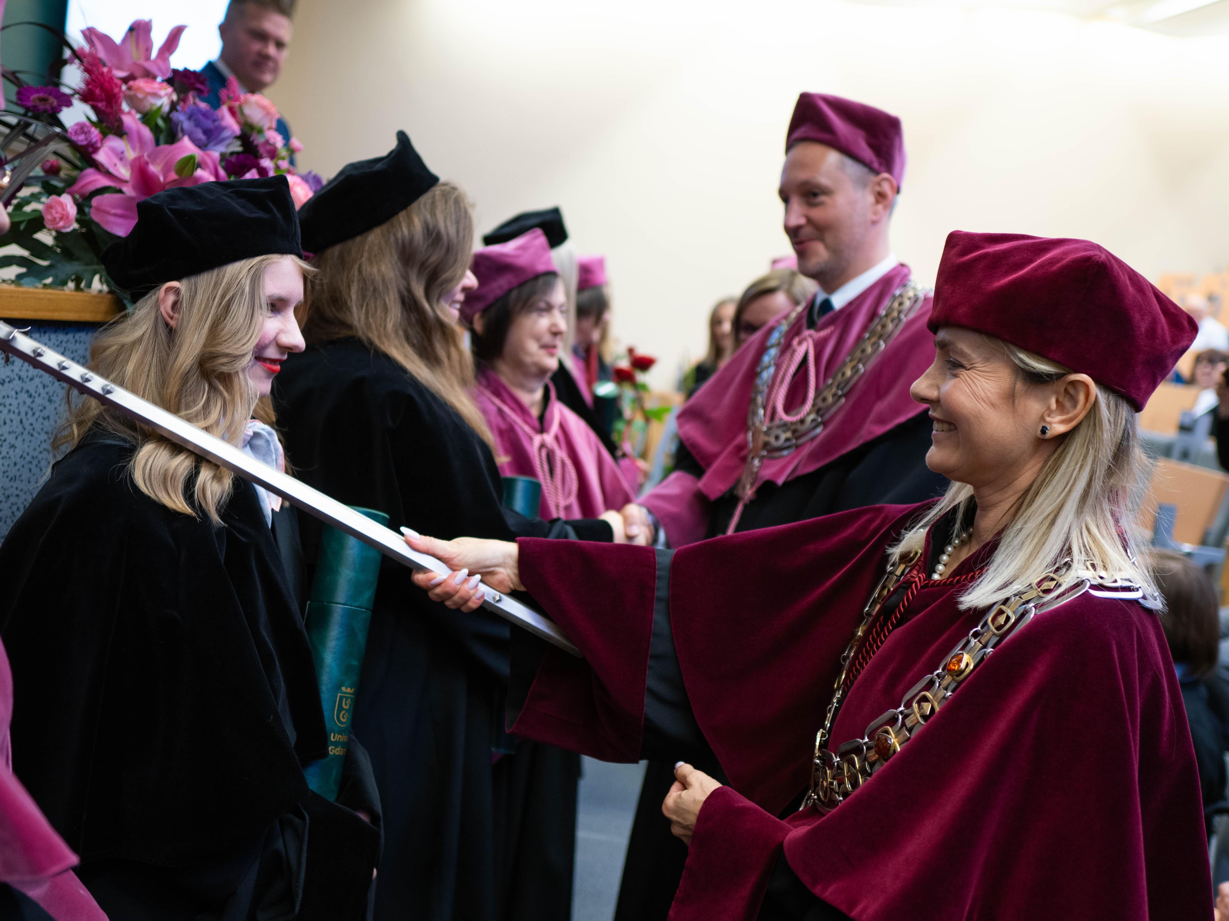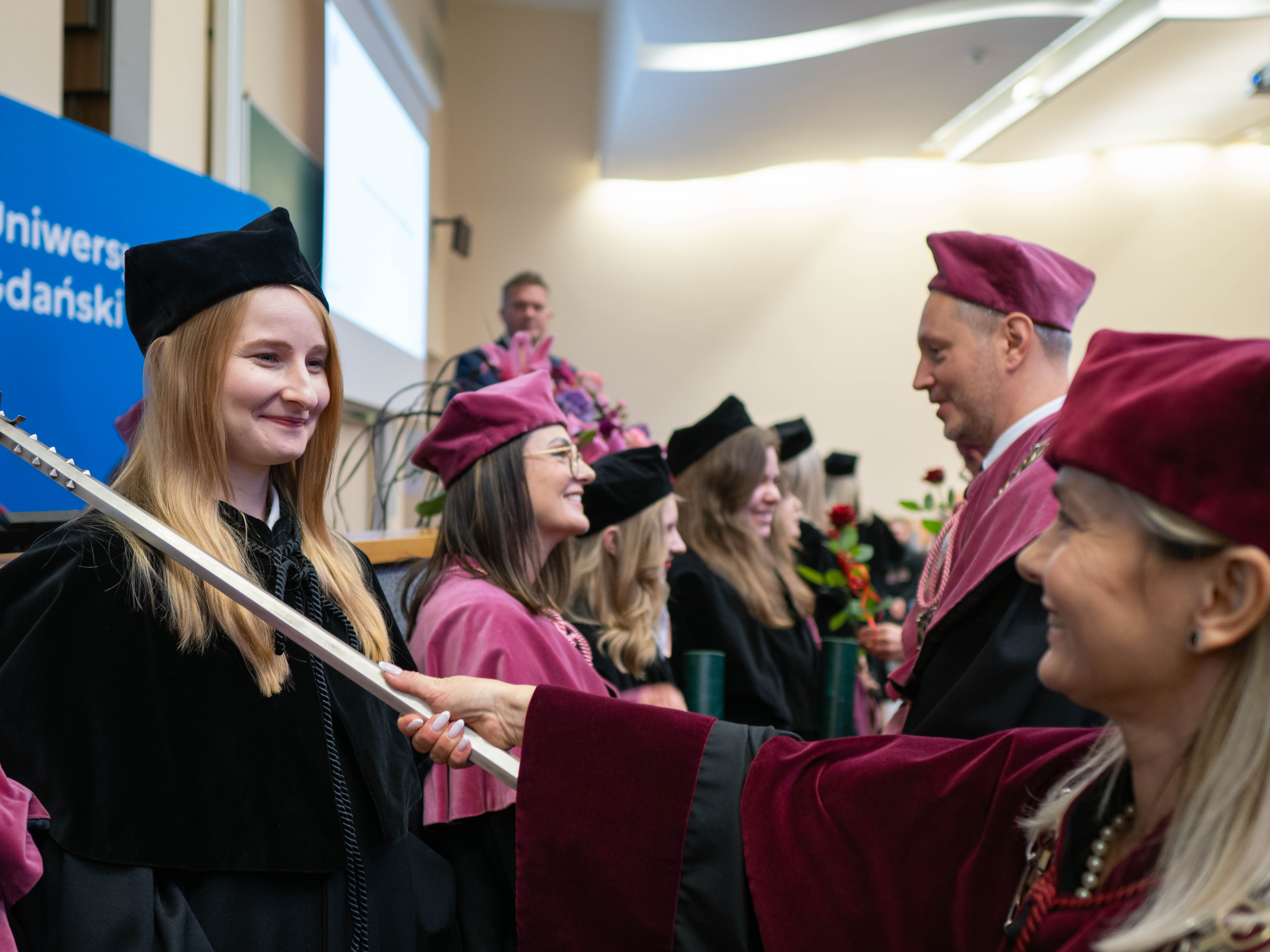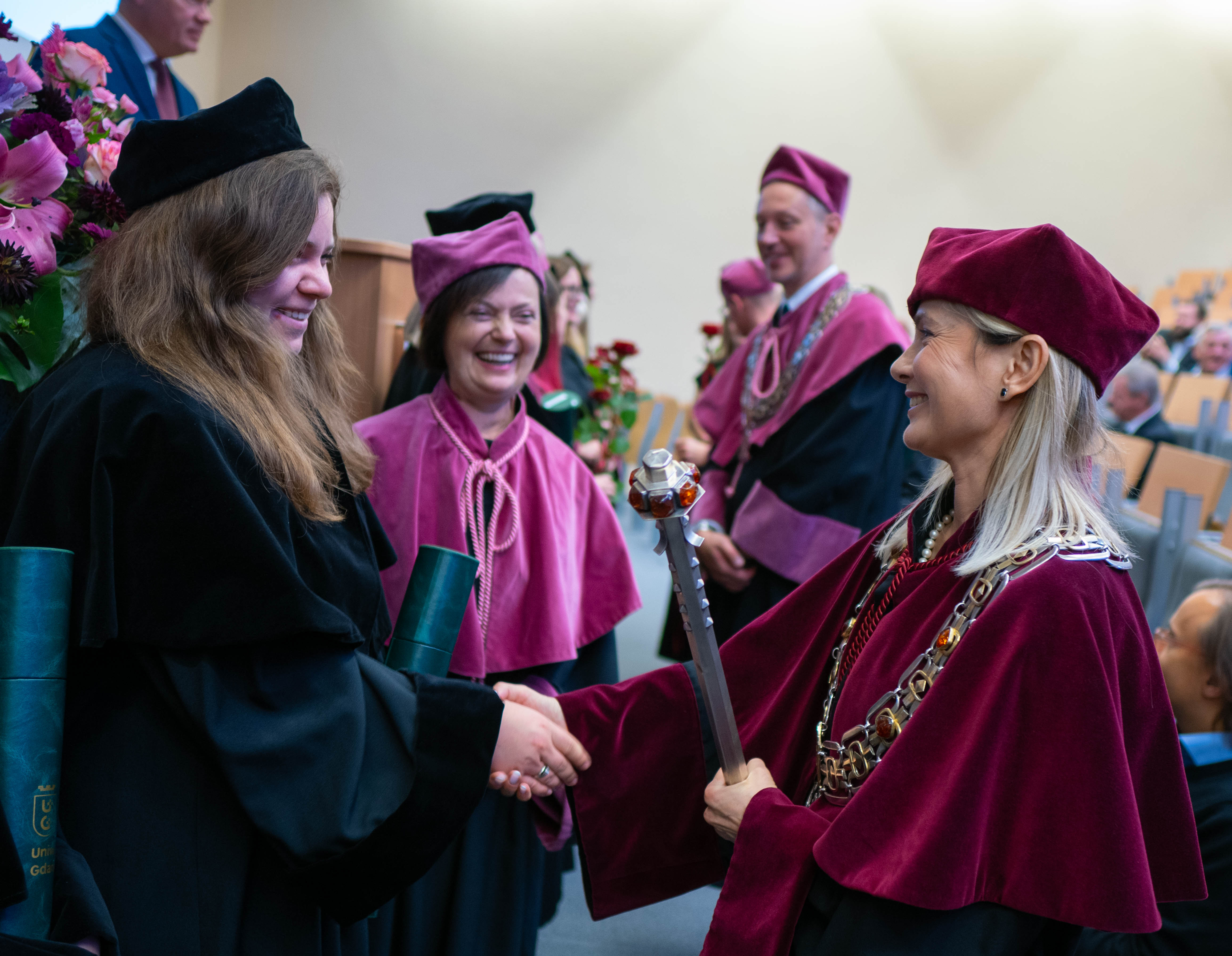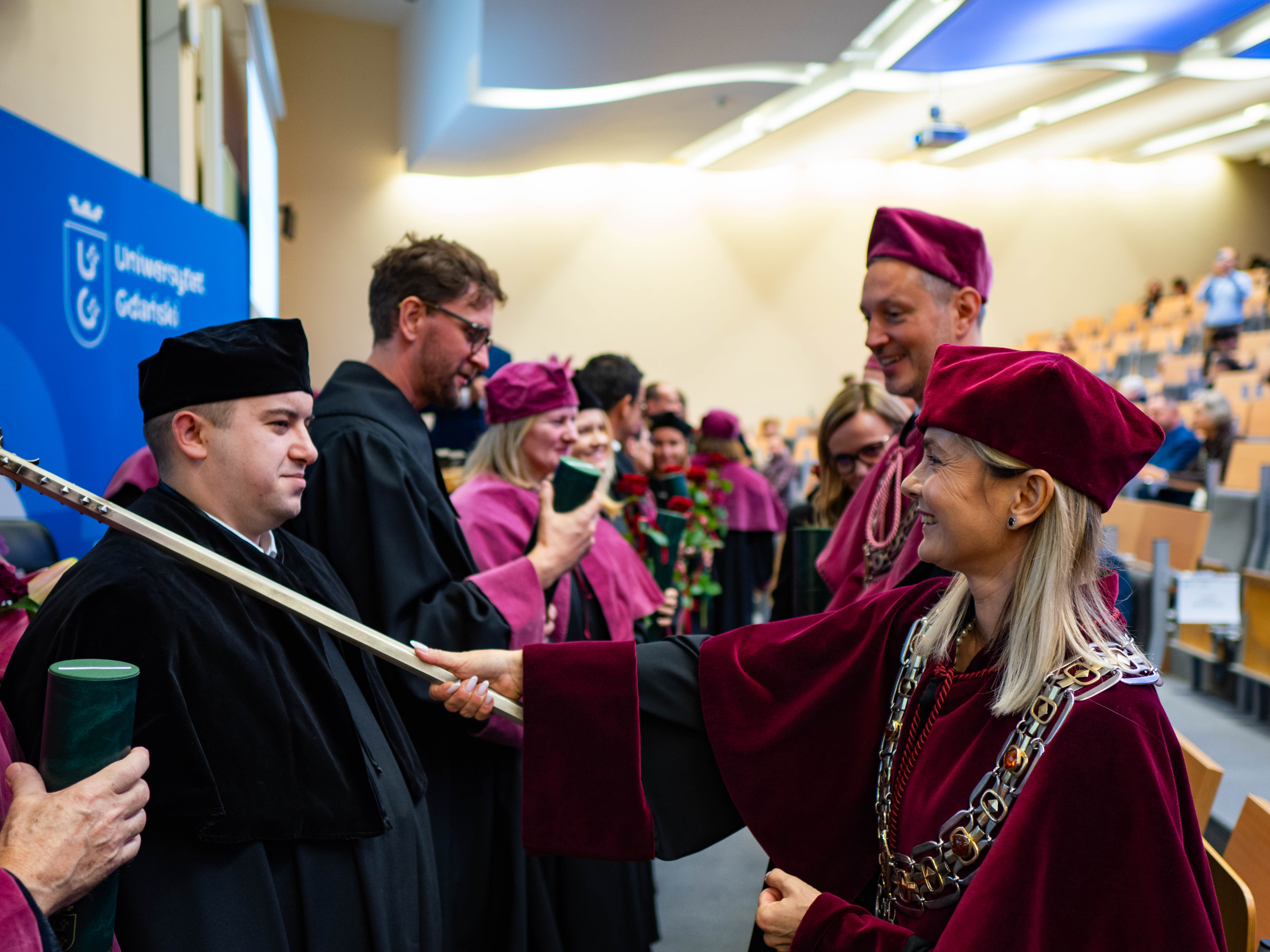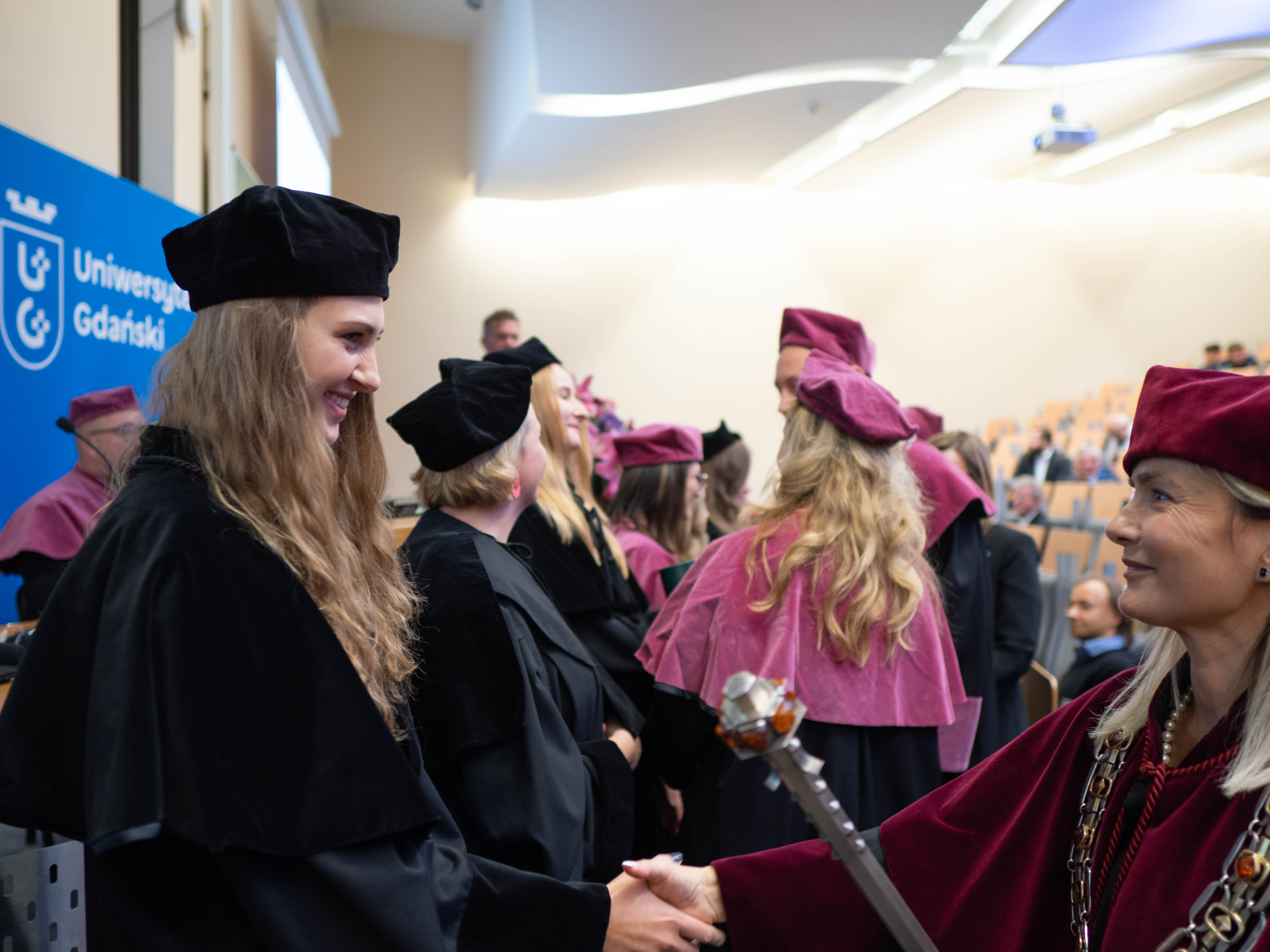 After the traditional Gaudeamus Igitur performed by the University of Gdańsk Academic Choir, prof. Michał Harciarek mentioned three professorial titles awarded to WNS researchers: prof. Danuta Plecka, prof. Monika Trojanowska and prof. Anna Maria Zawadzka. Commemorative diplomas on the occasion of the degrees were presented by the Vice-Rector for Cooperation and Internationalisation, dr hab. Anna Jurkowska-Zeidler, prof. UG. The inauguration was followed by the presentation of postdoctoral diplomas and doctoral promotions. The doctoral students then took the traditional oath before prof. A. Jurkowska-Zeidler.