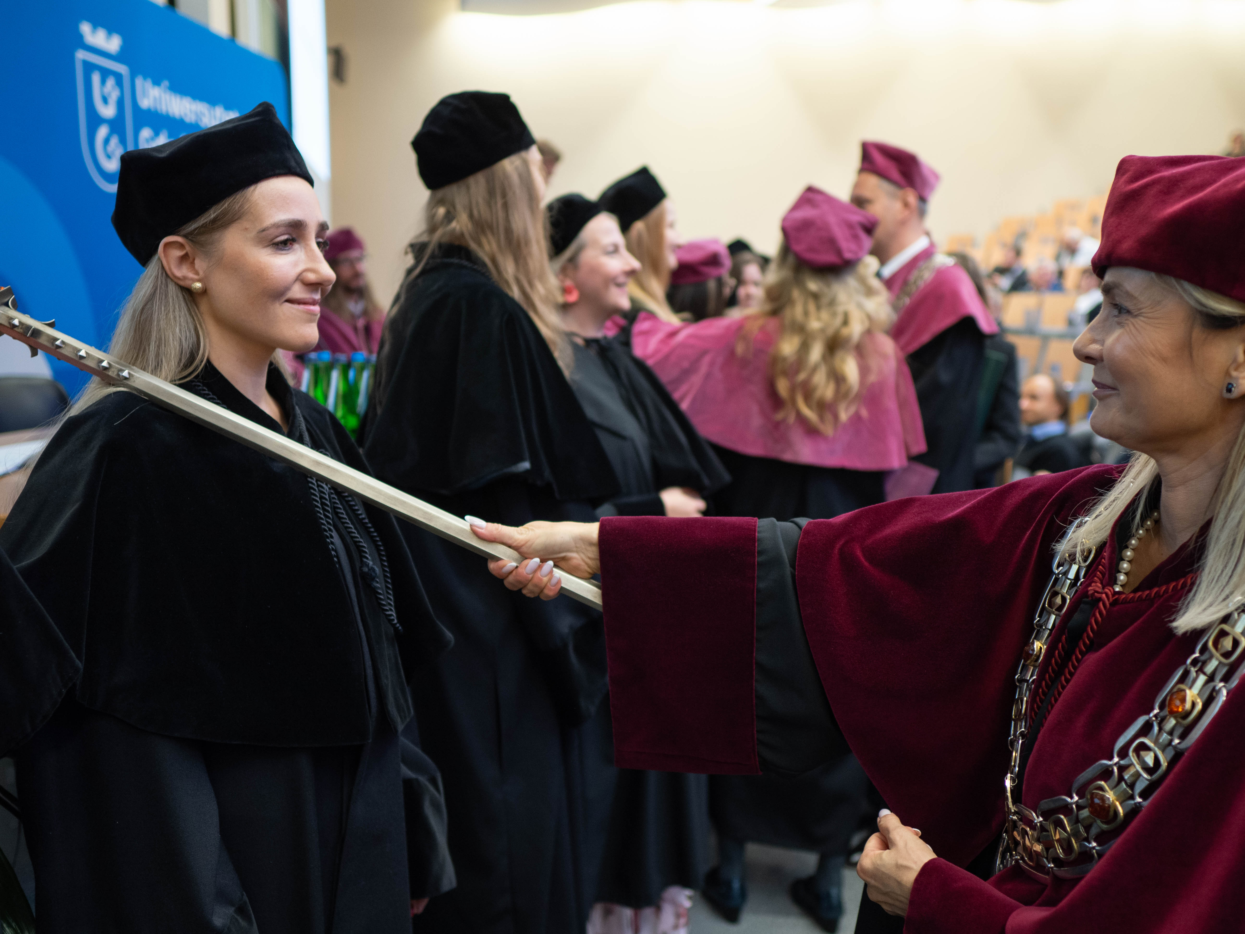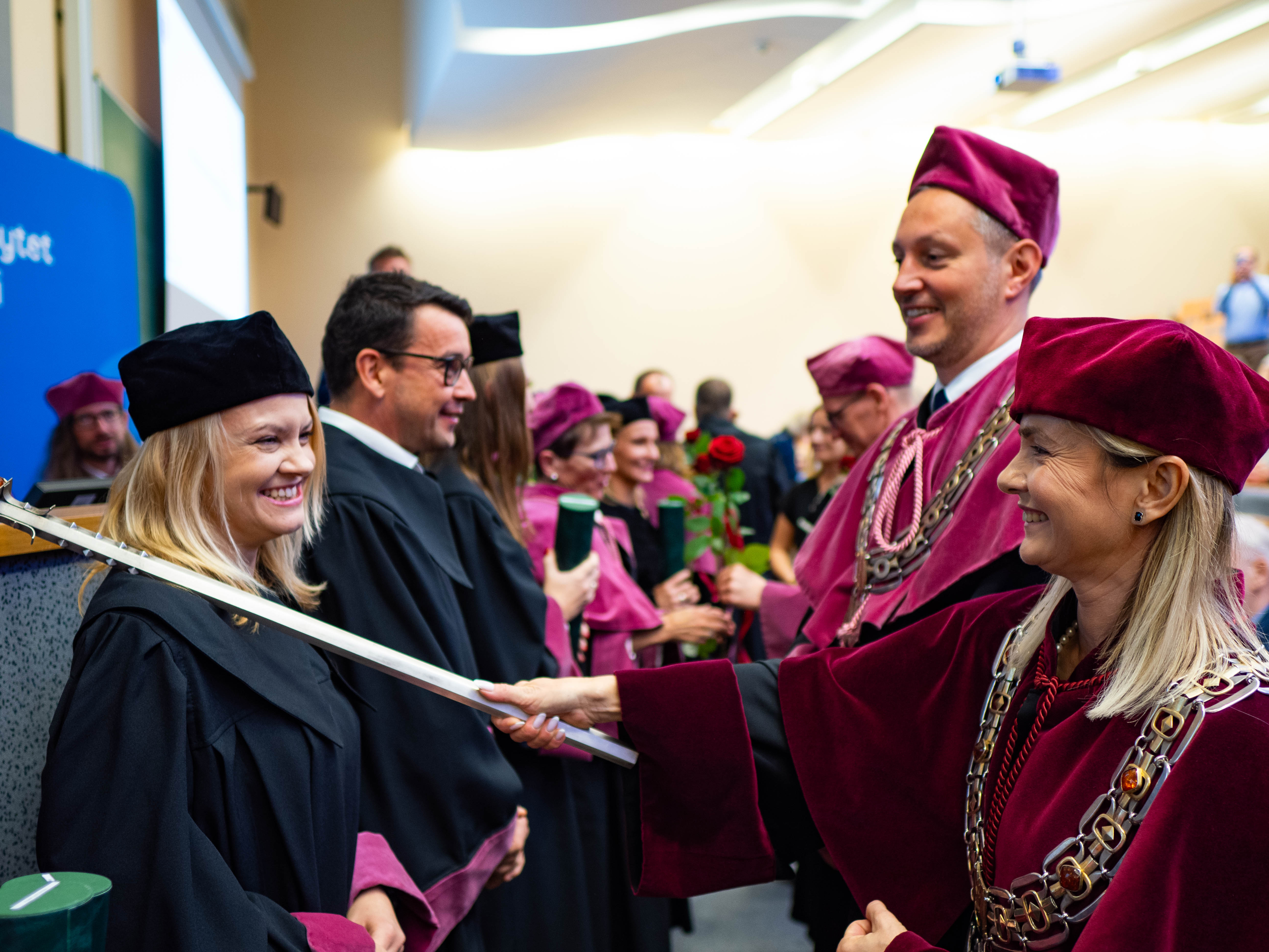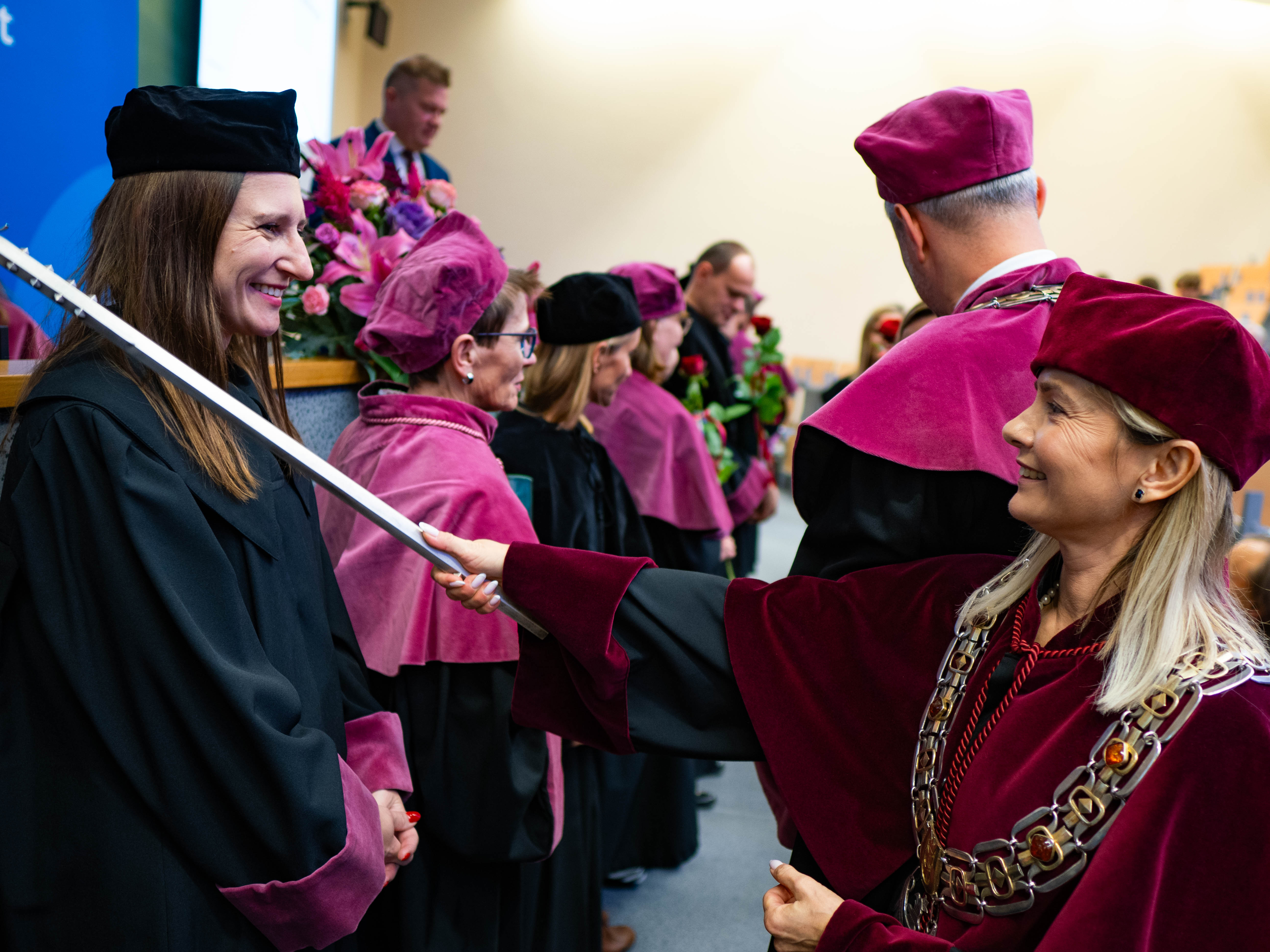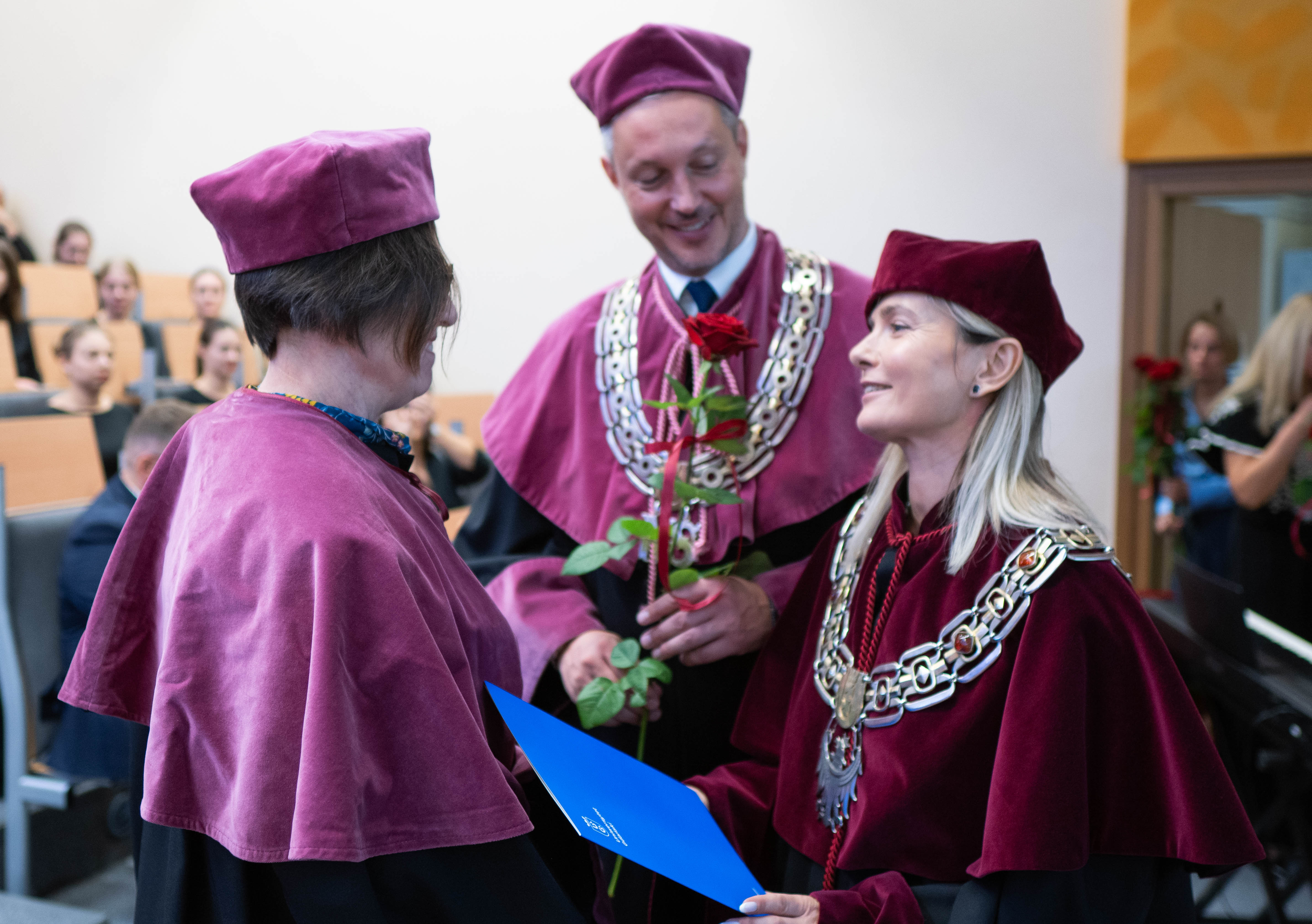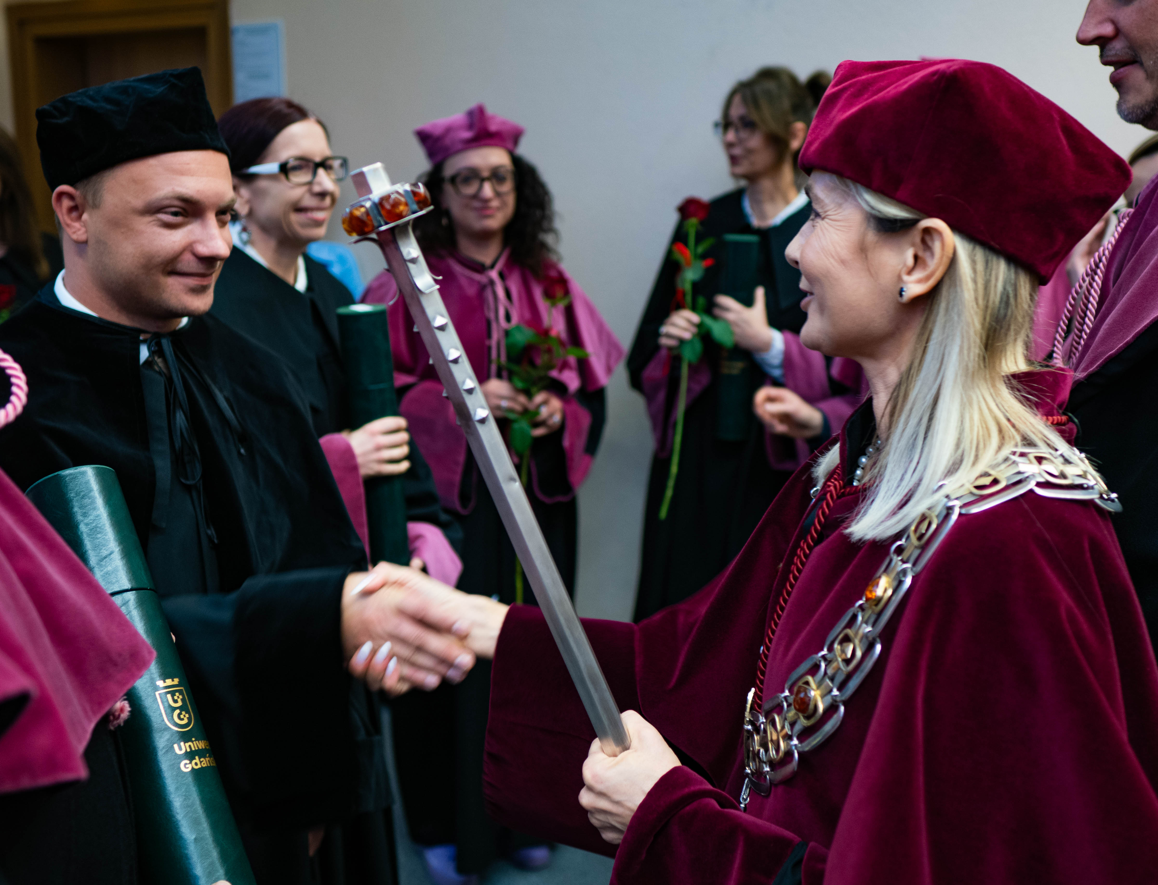 After the traditional Gaudeamus Igitur performed by the University of Gdańsk Academic Choir, prof. Michał Harciarek mentioned three professorial titles awarded to WNS researchers: prof. Danuta Plecka, prof. Monika Trojanowska and prof. Anna Maria Zawadzka. Commemorative diplomas on the occasion of the degrees were presented by the Vice-Rector for Cooperation and Internationalisation, dr hab. Anna Jurkowska-Zeidler, prof. UG. The inauguration was followed by the presentation of postdoctoral diplomas and doctoral promotions. The doctoral students then took the traditional oath before prof. A. Jurkowska-Zeidler.