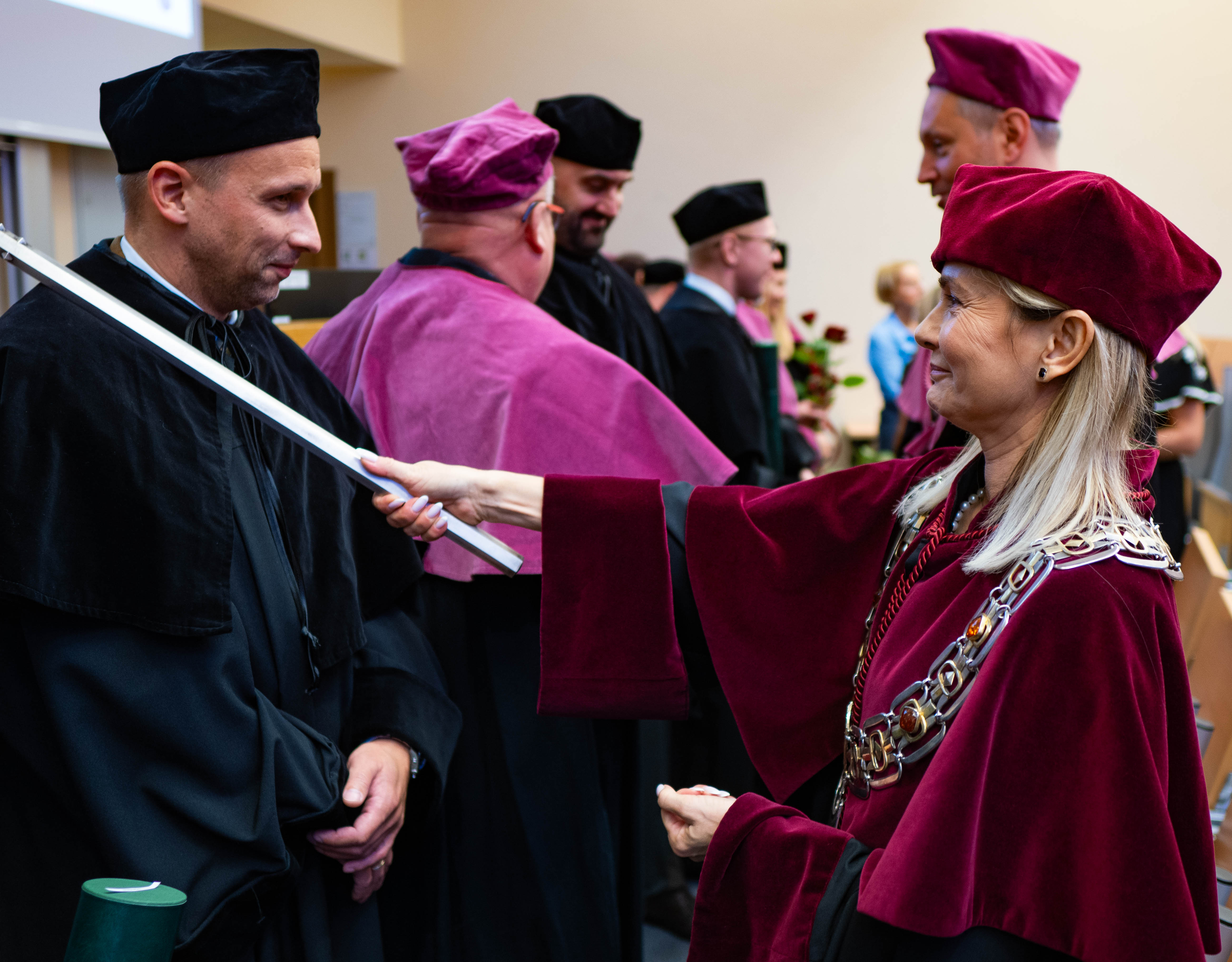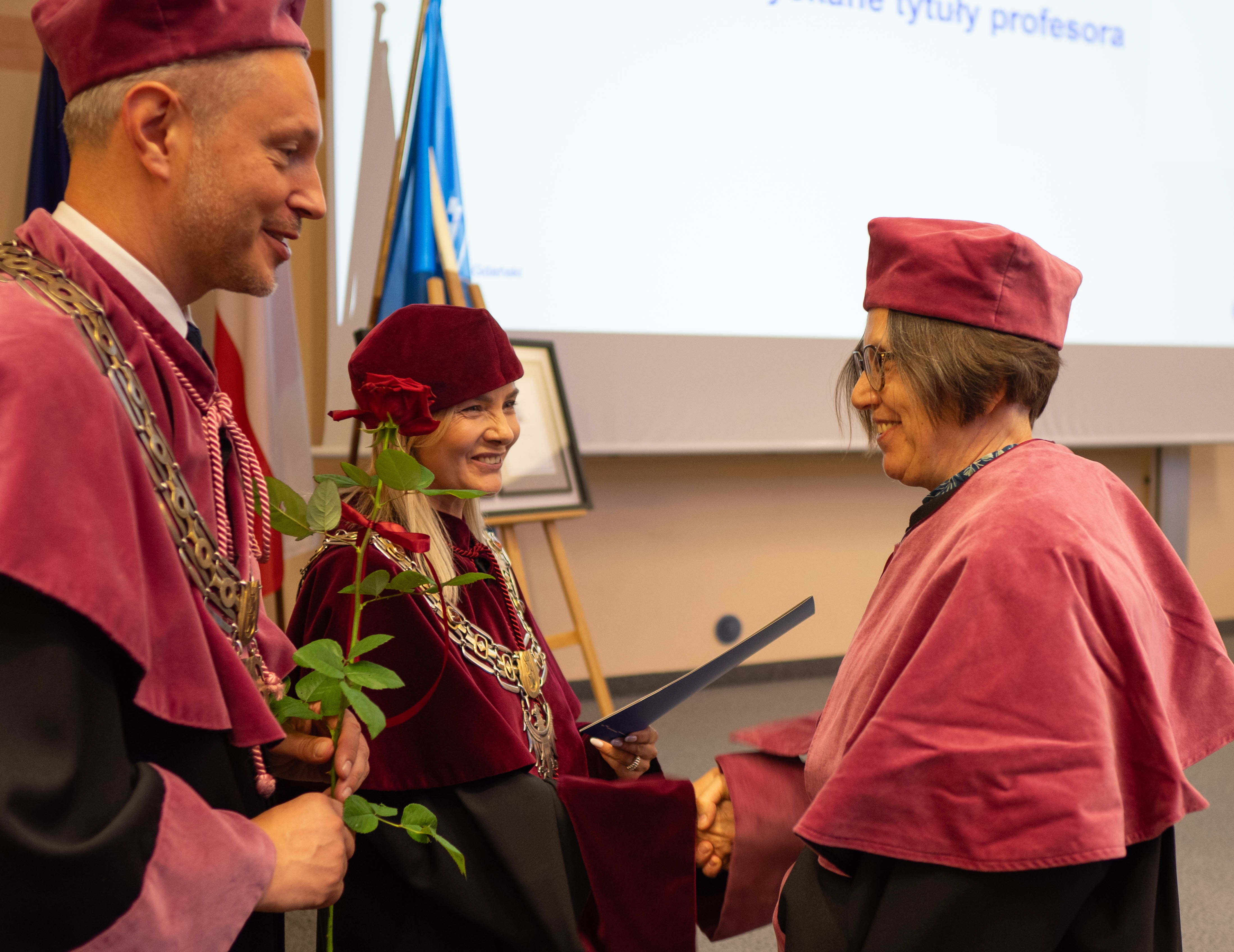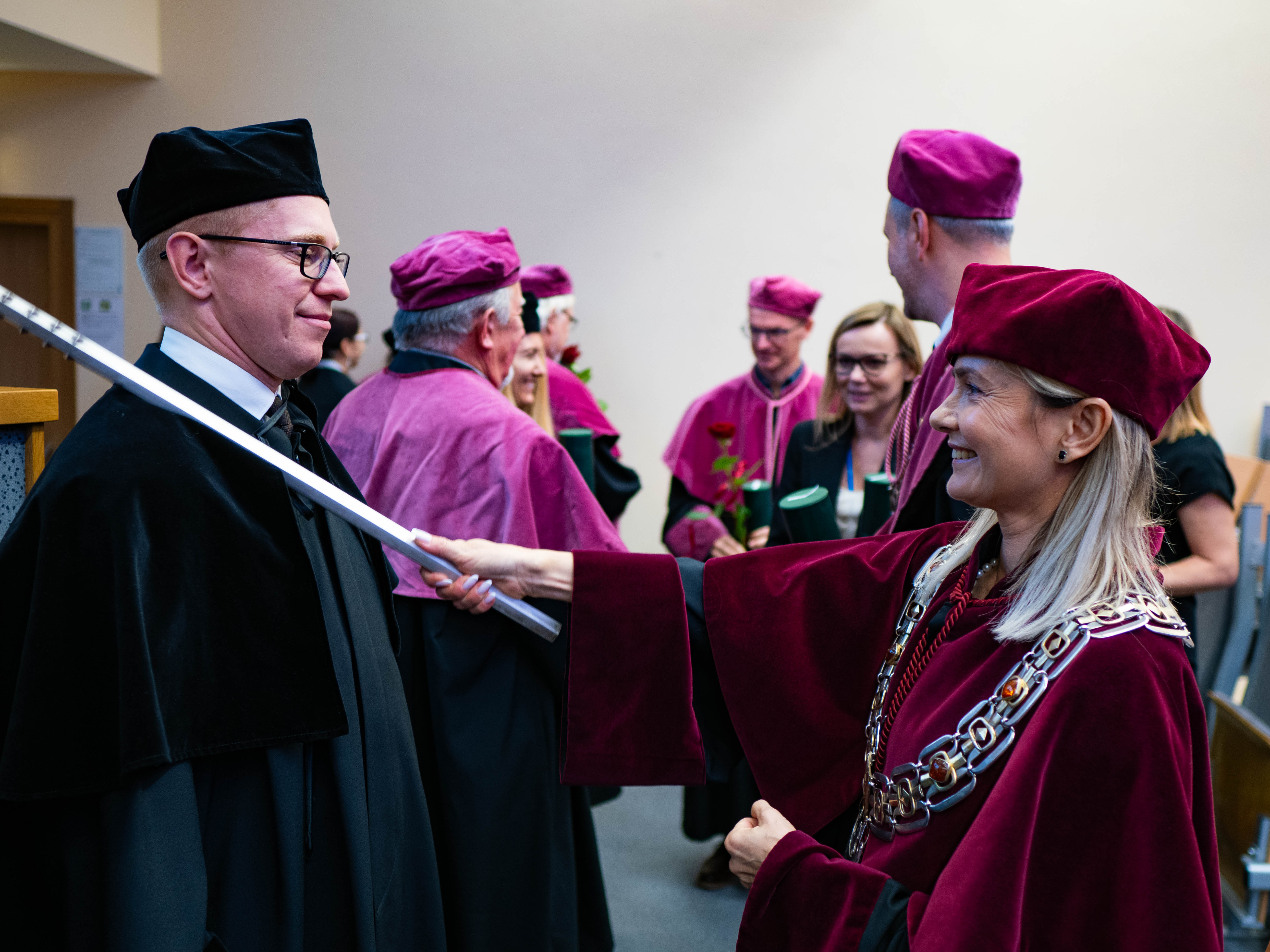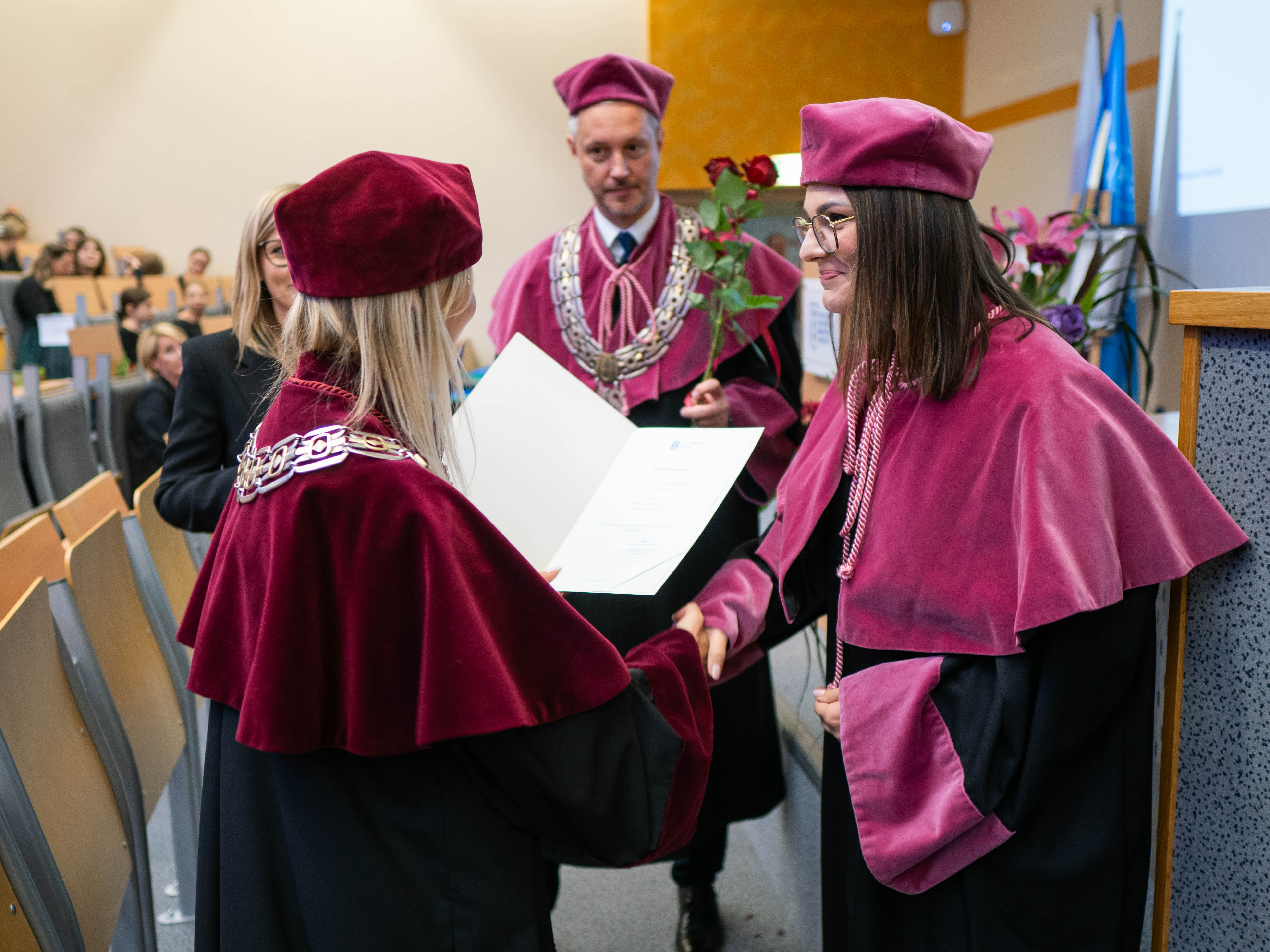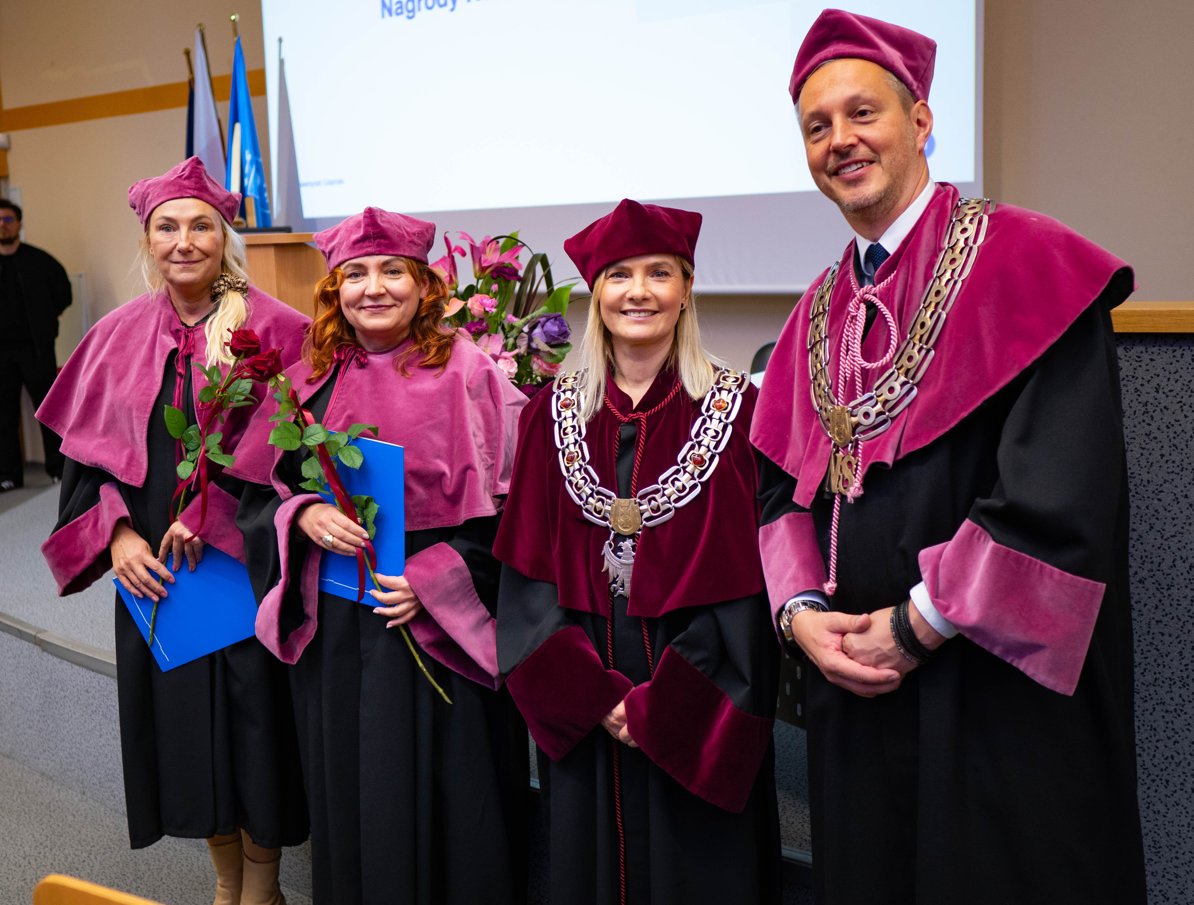After the traditional Gaudeamus Igitur performed by the University of Gdańsk Academic Choir, prof. Michał Harciarek mentioned three professorial titles awarded to WNS researchers: prof. Danuta Plecka, prof. Monika Trojanowska and prof. Anna Maria Zawadzka. Commemorative diplomas on the occasion of the degrees were presented by the Vice-Rector for Cooperation and Internationalisation, dr hab. Anna Jurkowska-Zeidler, prof. UG. The inauguration was followed by the presentation of postdoctoral diplomas and doctoral promotions. The doctoral students then took the traditional oath before prof. A. Jurkowska-Zeidler.