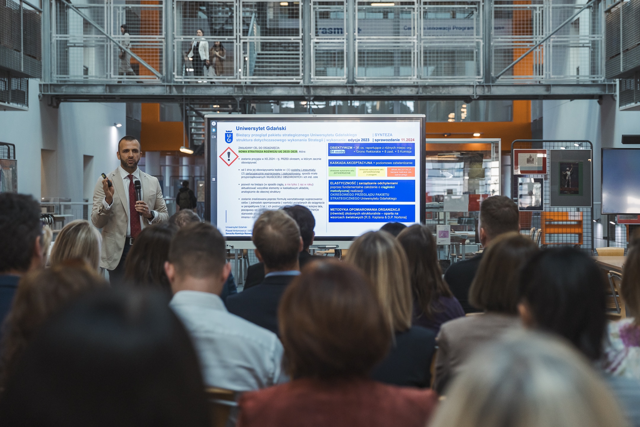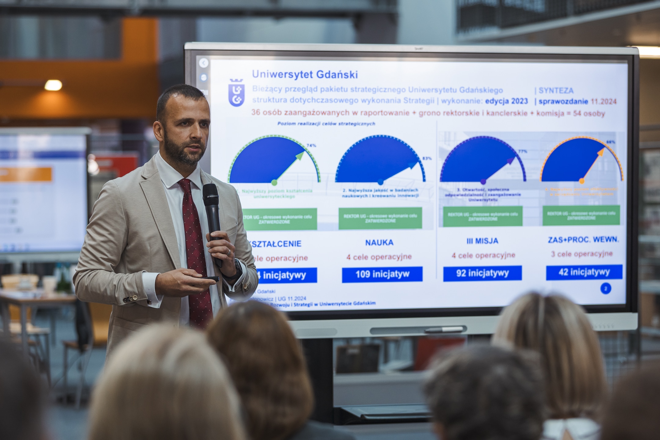 Vice-Rector prof. P. Antonowicz also presented the results of the implementation of the current UG strategy, visualised in the form of potentiometers that indicate the percentage level of implementation of current strategic objectives. ‘Our current Strategy encompasses more than 360 reported initiatives directly related to the University's strategic goals, and more than 50 people are currently involved in data reporting,' prof. Paweł Antonowicz conveyed. In the UG Development Strategy for 2025 - 2030, which is being prepared, there will be more of these people, each of the operational goals developed will be assigned to the relevant UG unit, and there are as many as 100 of these goals - compared to the 64 that were identified in the Strategy for 2020 - 2025.