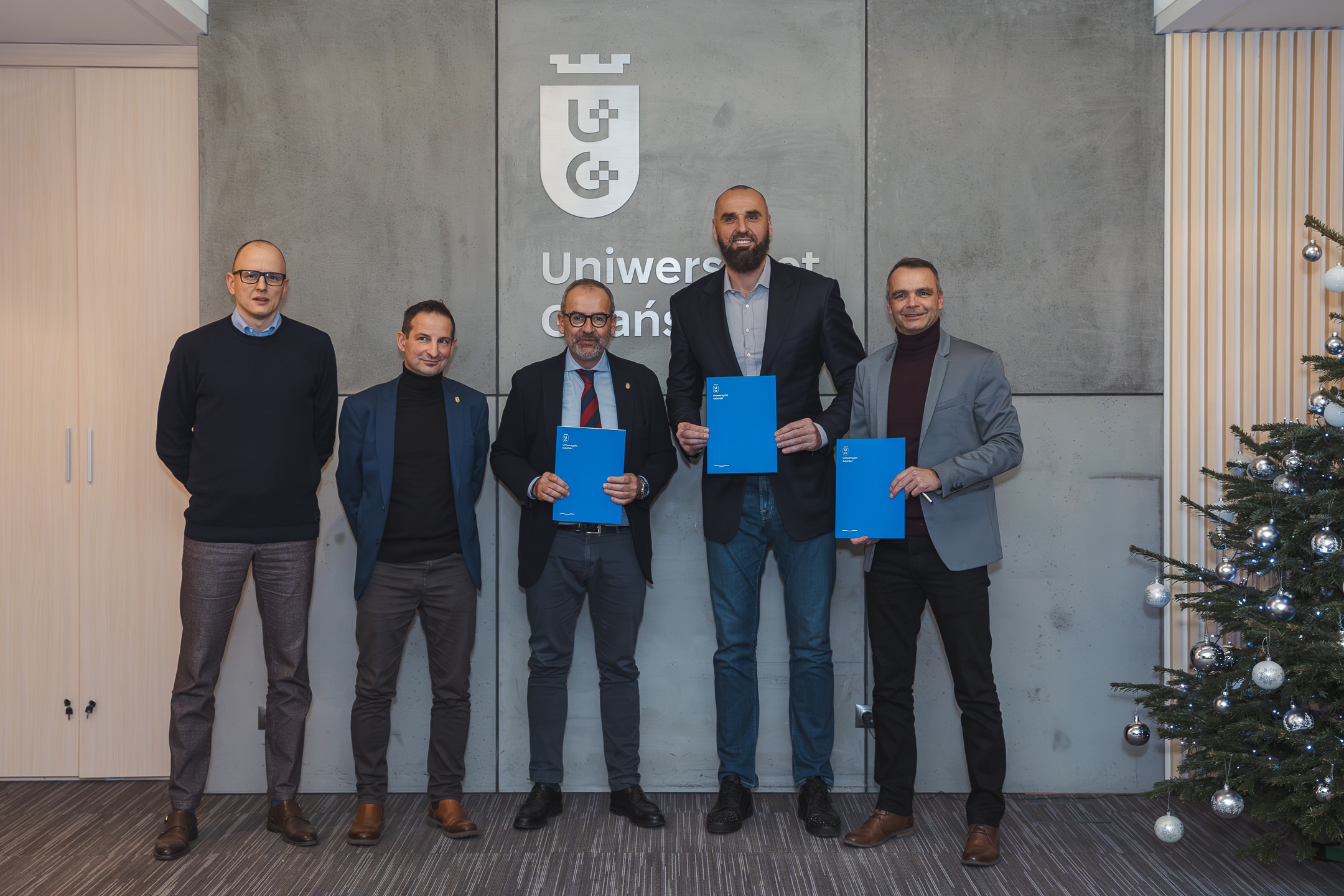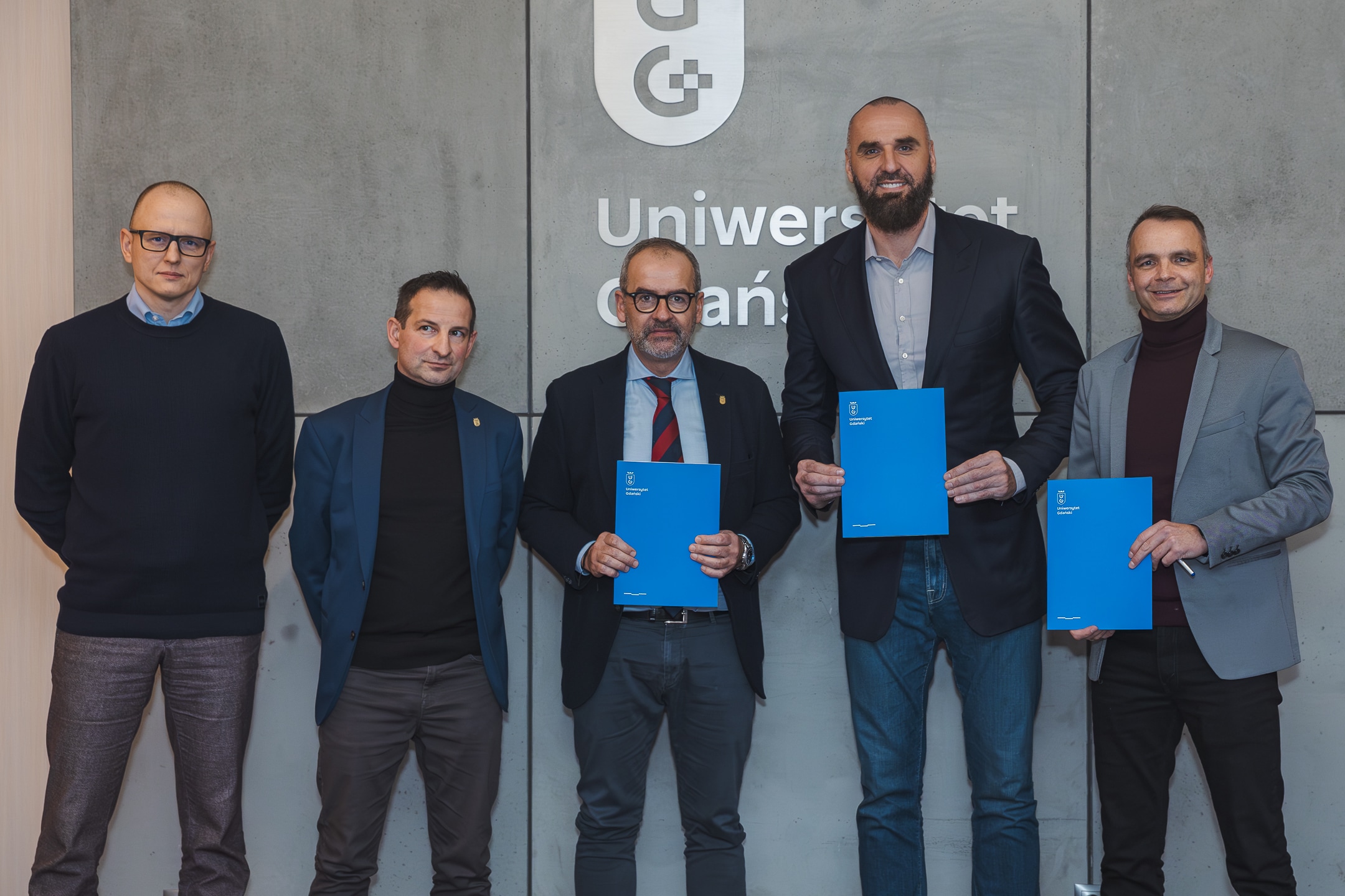 The meeting was attended by prof. dr hab. Piotr Stepnowski, Rector of UG, Tomasz Aftański, Director of the Centre for Physical Education and Sport, Piotr Walczak, President of ASA UG, Marcin Gortat, Jakub Urbanowicz, President of the Management Board of MG13 company, Paweł Krawczyk, President of Gortat School Gdańsk and Bartłomiej Perzanowski, President of Gortat Academy Gdańsk.
